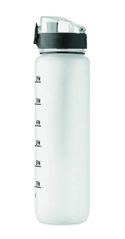 Sportkulacs RPET-ből, motivációs időjelzéssel, egy kézzel nyitható, felpattintható fedéllel, biztonsági zárral és hordfüllel. Szivárgásmentes. Űrtartalom: 1 liter.
