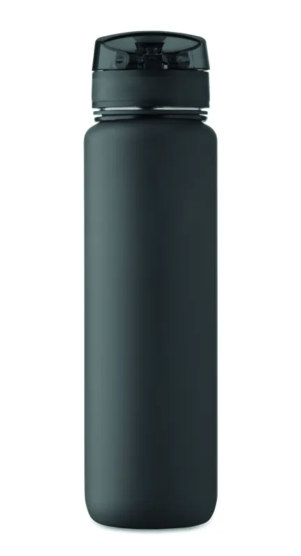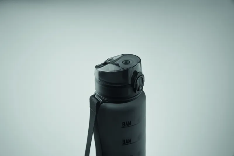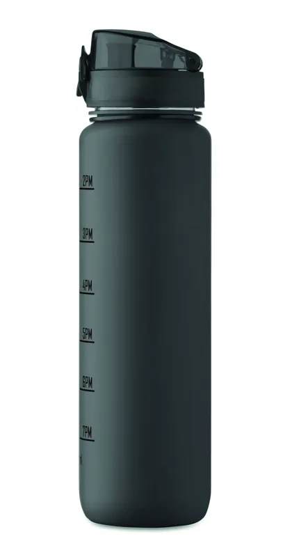 Sportkulacs RPET-ből, motivációs időjelzéssel, egy kézzel nyitható, felpattintható fedéllel, biztonsági zárral és hordfüllel. Szivárgásmentes. Űrtartalom: 1 liter.