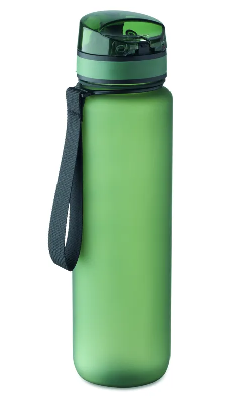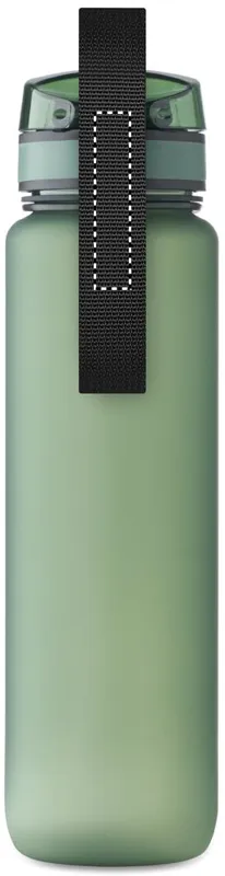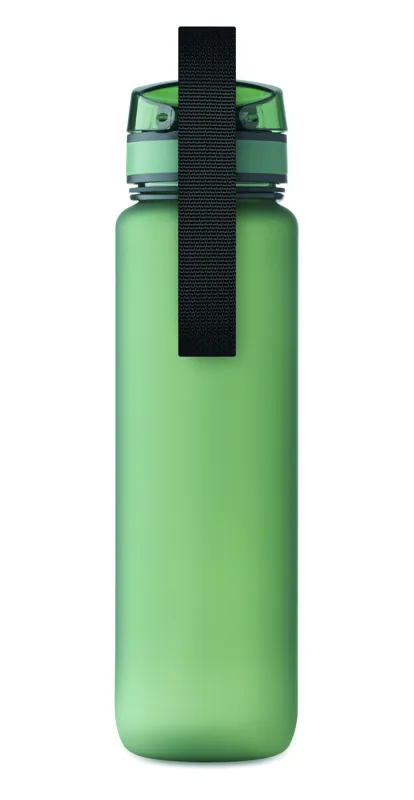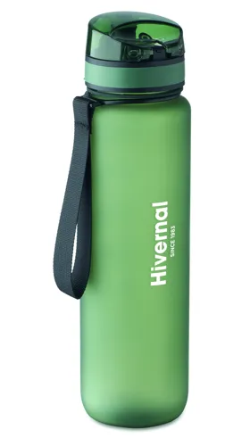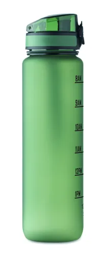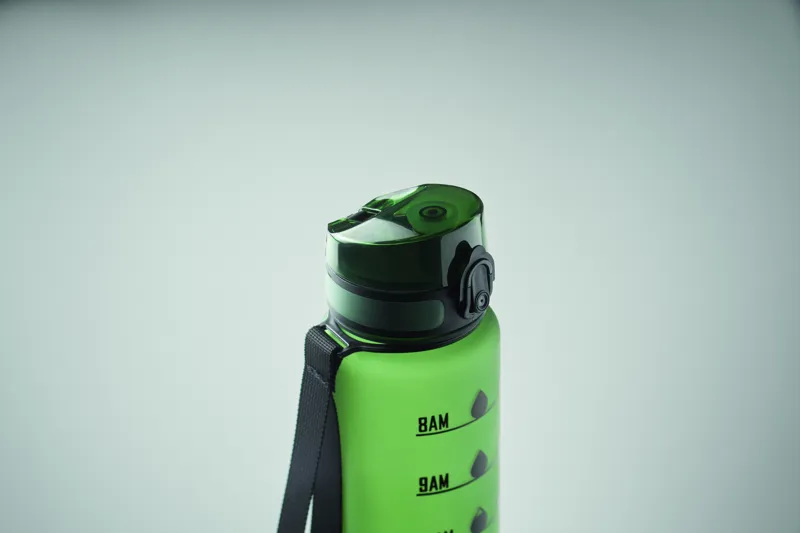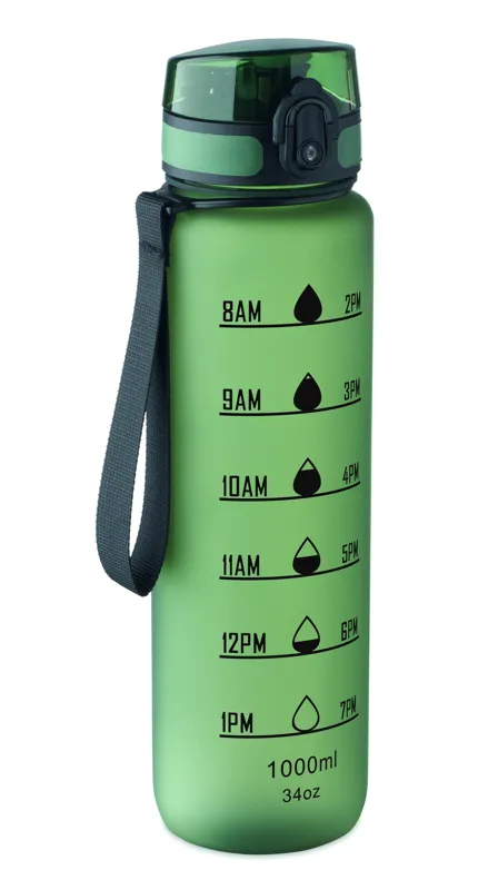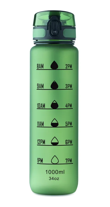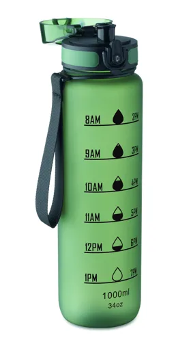 Sportkulacs RPET-ből, motivációs időjelzéssel, egy kézzel nyitható, felpattintható fedéllel, biztonsági zárral és hordfüllel. Szivárgásmentes. Űrtartalom: 1 liter.