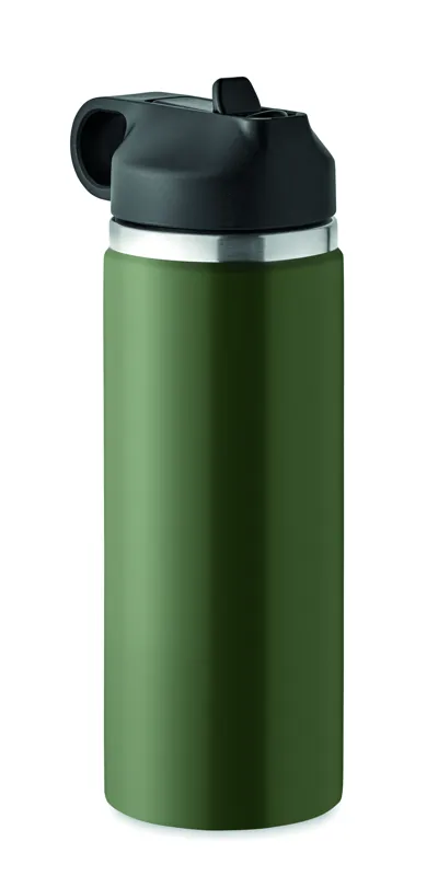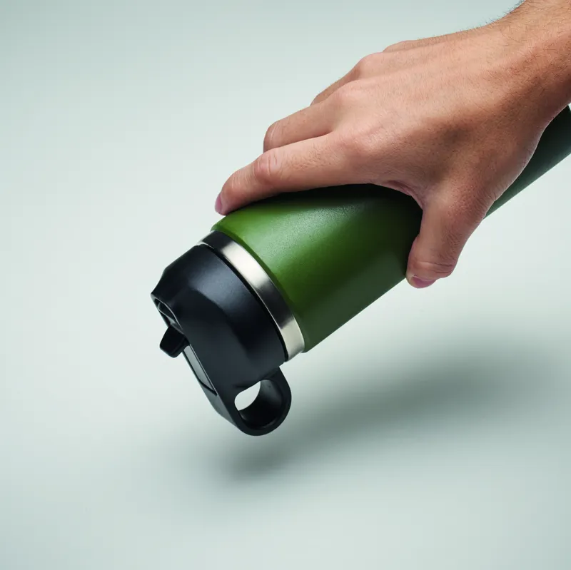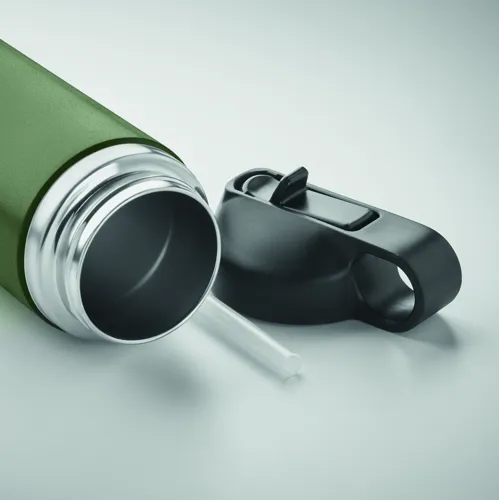 Duplafalú, újrahasznosított rozsdamentes acél (90% újrahasznosított rozsdamentes acél, 10% rozsdamentes acél) termoszpalack, PP fogantyús és beépített szívószálas fedéllel. Szivárgásmentes. Űrtartalom: 500 ml.