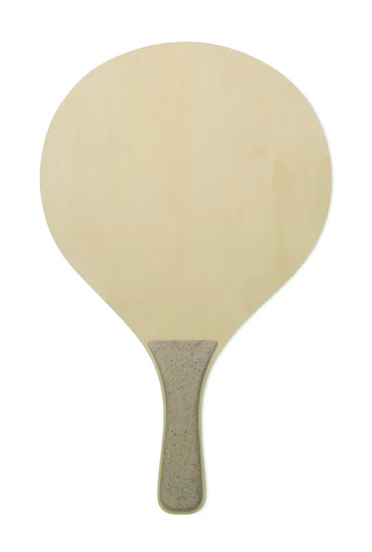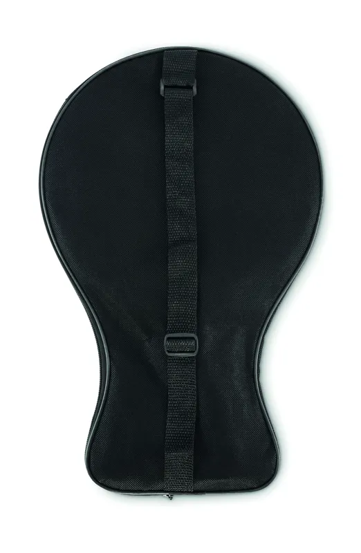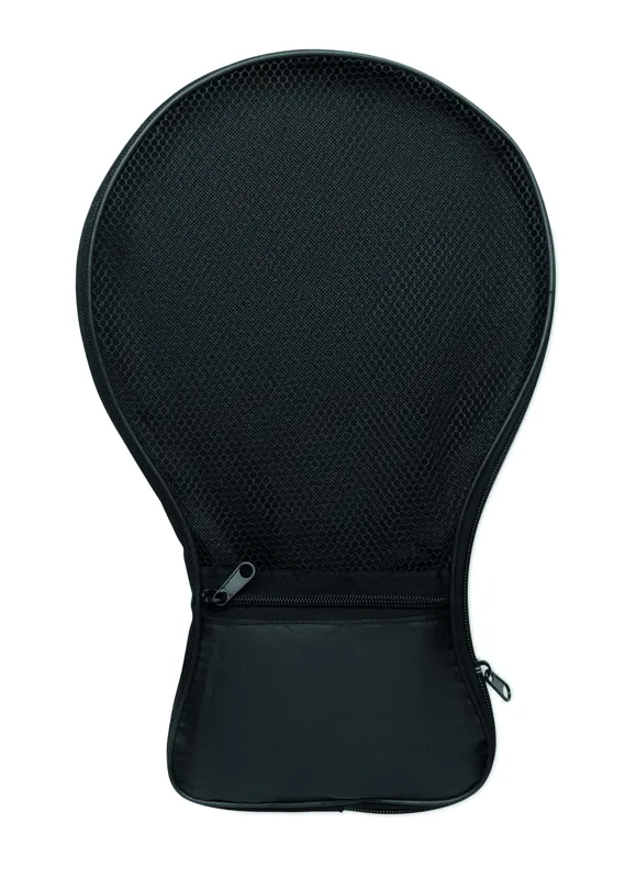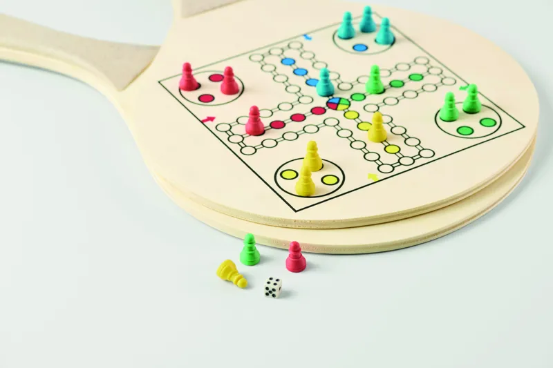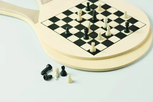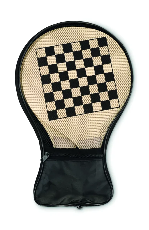 Strandjáték szett 2 rétegelt lemez ütővel, oldalukon sakk- és ''ki nevet a végén'' játéktáblával. Tartalmaz 1 TPR labdát, dobókockát és bábukat. RPET hálós cipzáras hordtáskában.