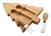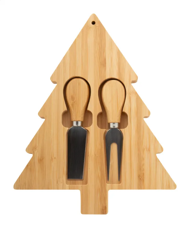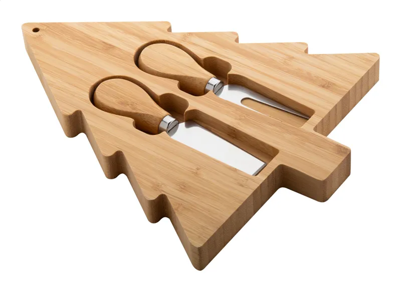 Karácsonyi bambusz sajtkés szett, karácsonyfa alakú vágódeszkával és 2 darab rozsdamentes acél sajtkéssel. Kraft papír dobozban szállítjuk.
