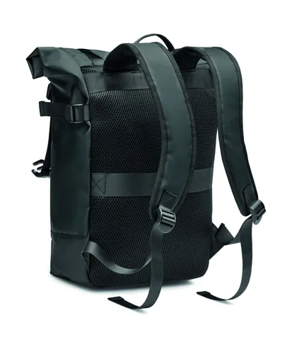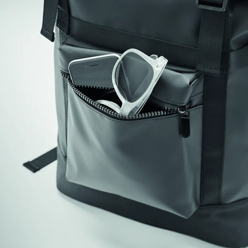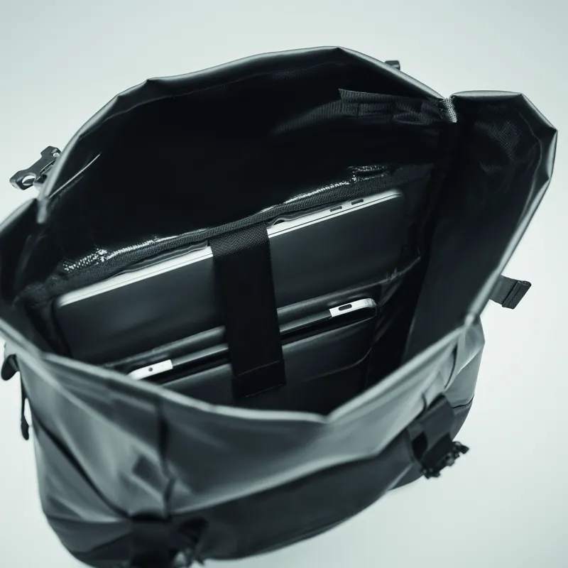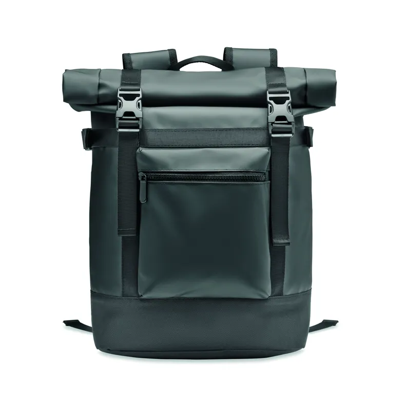 Roll top csavart záródású hátizsák 50C tarpaulin anyagból, párnázott háttal, állítható vállpántokkal, elülső cipzáras zsebbel.