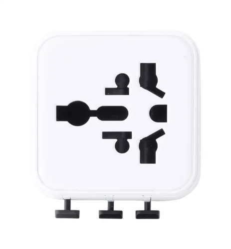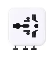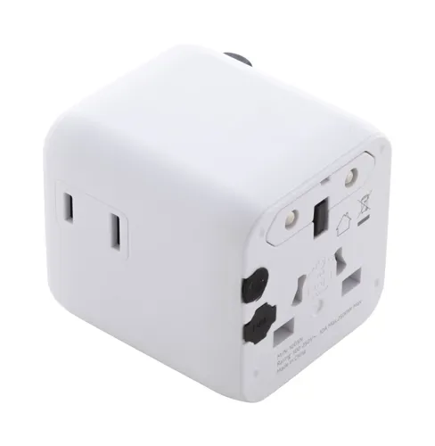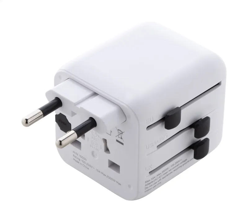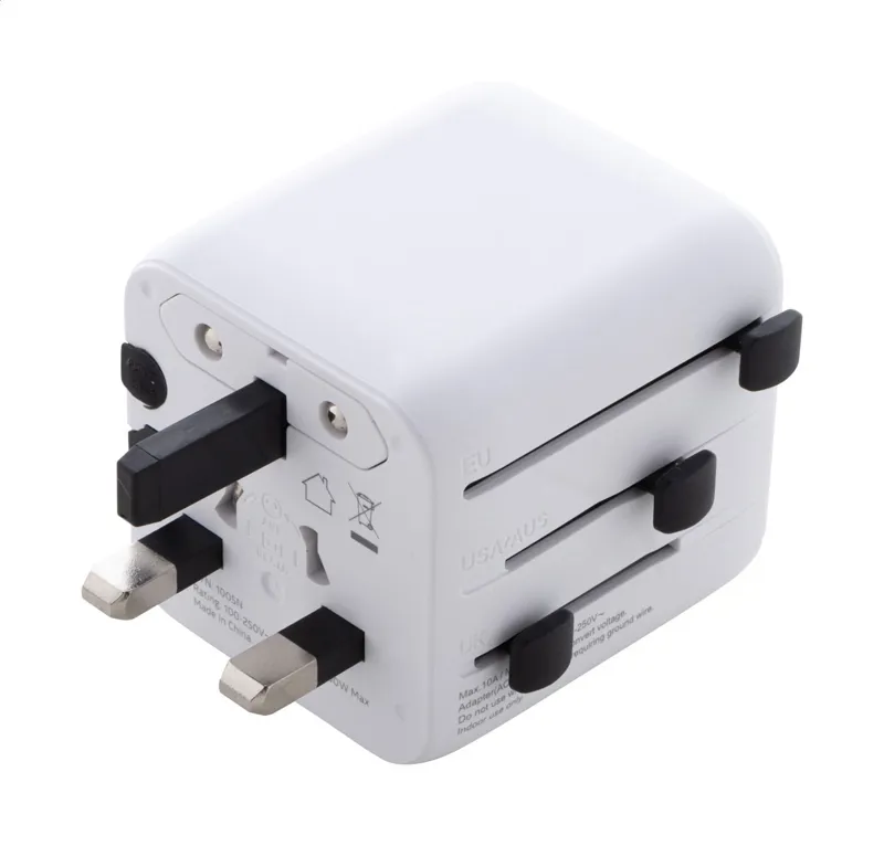 Ultrakompakt, univerzális, világszerte használható utazási adapter újrahasznosított PC-műanyagból, beépített fali csatlakozókkal az USA, Európa, Egyesült Királyság és Ausztrália látogatására.