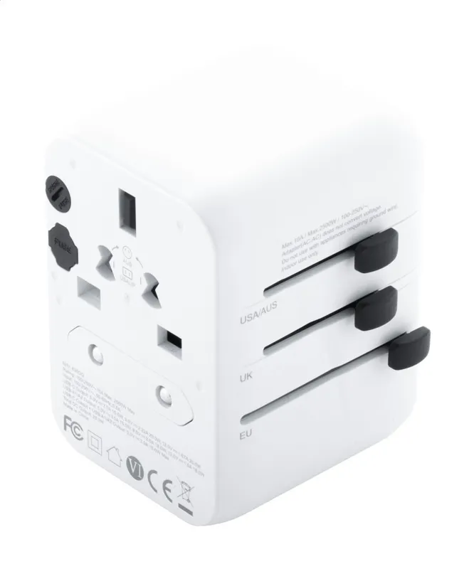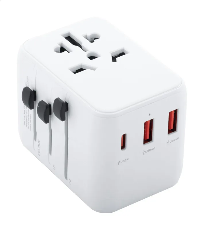 Univerzális, ABS műanyagból készült úti adapter, USA, EU, UK és Ausztrália szabványainak megfelelő csatlakozókkal. 2 USB és 1 USB-C csatlakozással. Gyorstöltő technológiával (PD20W).