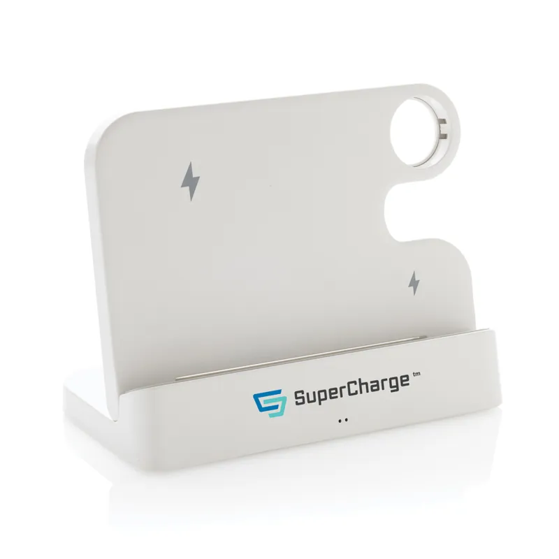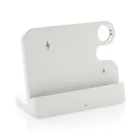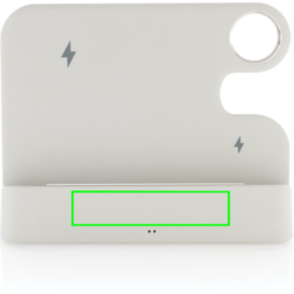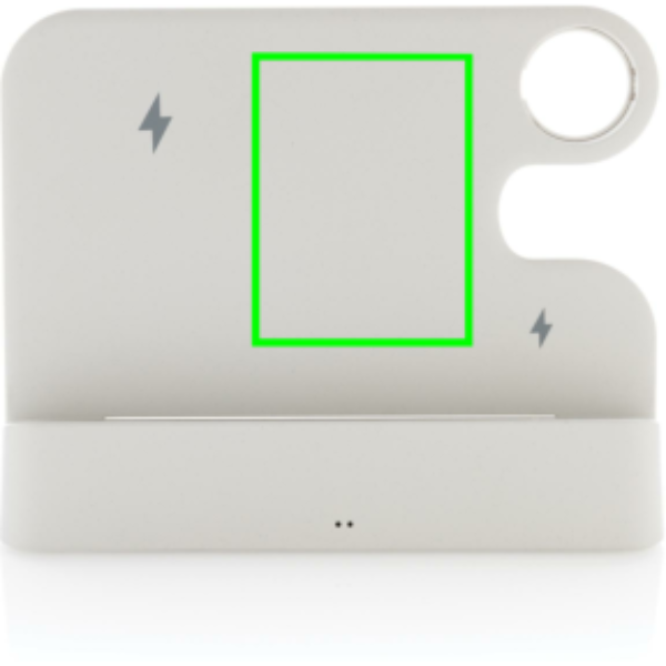 Összecsukható kialakítású töltőállvány 15W-os vezeték nélküli töltővel, újrahasznosított ABS-ből. Második 5 W-os vezeték nélküli töltővel kisebb tárgyak, például fülhallgatók töltéséhez. iWatch-foglalattal az iWatch hivatalos töltőkábelének illesztéséhez. A hátoldalon egy 5 V/1 A USB-A és egy USB-C kimeneti port található a kábelen keresztül történő töltéshez. Szilikon hegyekkel az alján, hogy elkerülje a csúszást, és szilikon párnázással az állványon, hogy a telefon tökéletes állapotban maradjon. Teljes újrahasznosított anyagtartalom: 80% a termék összsúlya alapján. Az RCS-tanúsítvány biztosítja az újrahasznosított anyagok ellátási láncát. FSC® csomagolásban. PVC-mentes. 120 cm-es USB-A - USB-C töltőkábellel RCS újrahasznosított TPE-ből. FSC® csomagolásban. PVC-mentes.