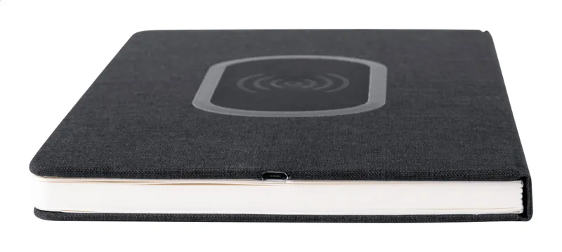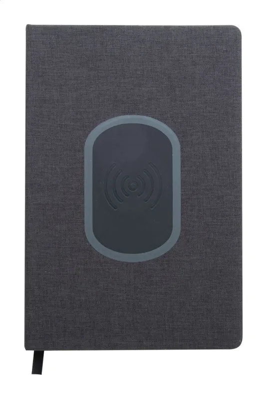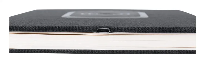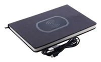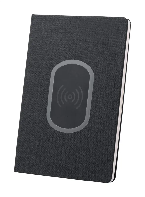 300D poliészter borítású, A5 méretű jegyzetfüzet beépített vezeték nélküli töltővel (5W) és 80 vonalas lappal. USB töltőkábellel szállítjuk.
