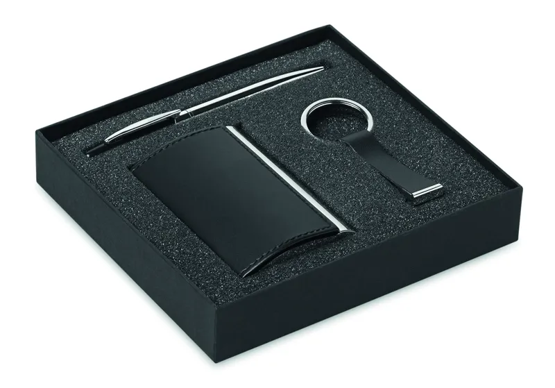 Üzleti ajándék szett dobozban. Tartalma: csavarmechanikás fém golyóstoll feketén író betéttel, rozsdamentes acél és PU kulcstartó, névjegykártya tartó.