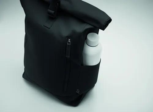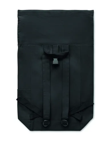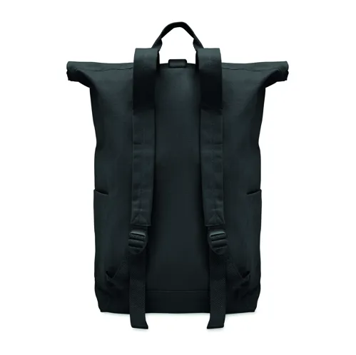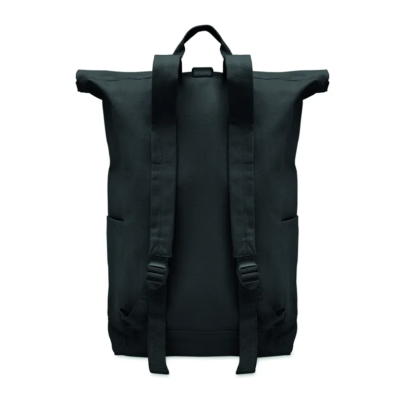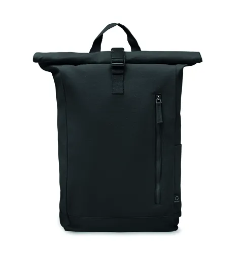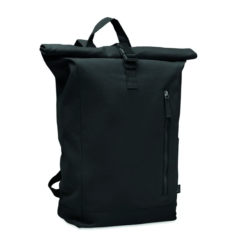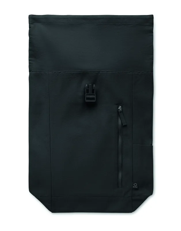 Rolltop csavart záródású hátizsák tépőzárral, 390 g/m² vastag újrahasznosított pamutból (80%) és újrahasznosított poliészterből (20%). Cipzáras elülső zsebbel.