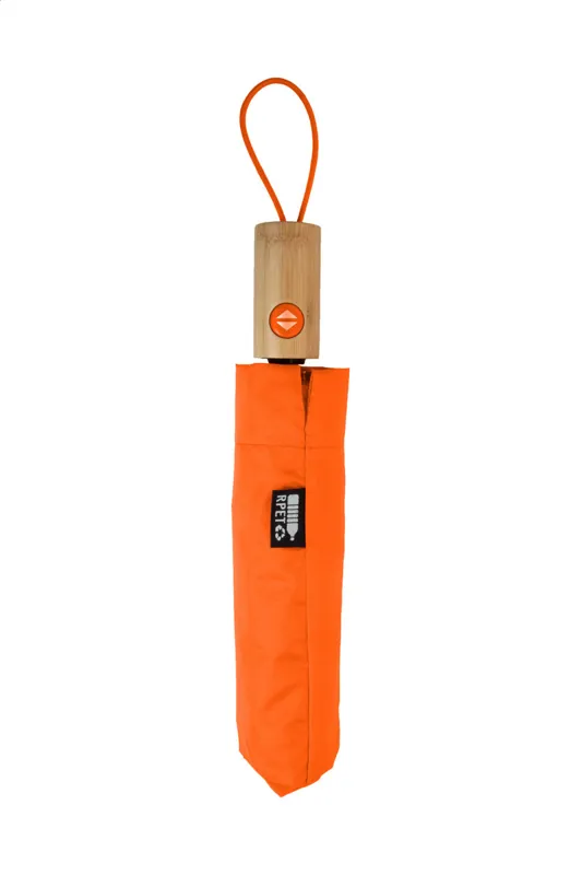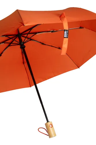 Automata (nyitás/zárás), szélálló, összecsukható esernyő 8 panellel, színben megegyező tasakban. Fém kerettel, üvegszálas vázzal és bordázattal és bambusz fogantyúval. 190T RPET pongee. Megkülönböztető RPET címkével.