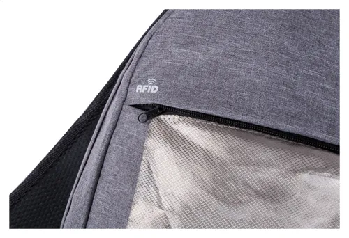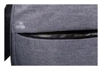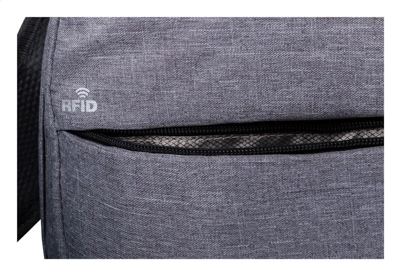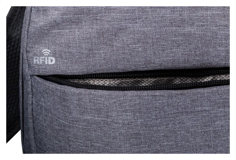 Hátizsák RFID védő funkcióval többrészes cipzáras rekesszel, laptoptartó rekesszel (15"), párnázott hátrésszel és vállpántokkal. Beépített USB csatlakozóval a power banknak. 300D poliészter.