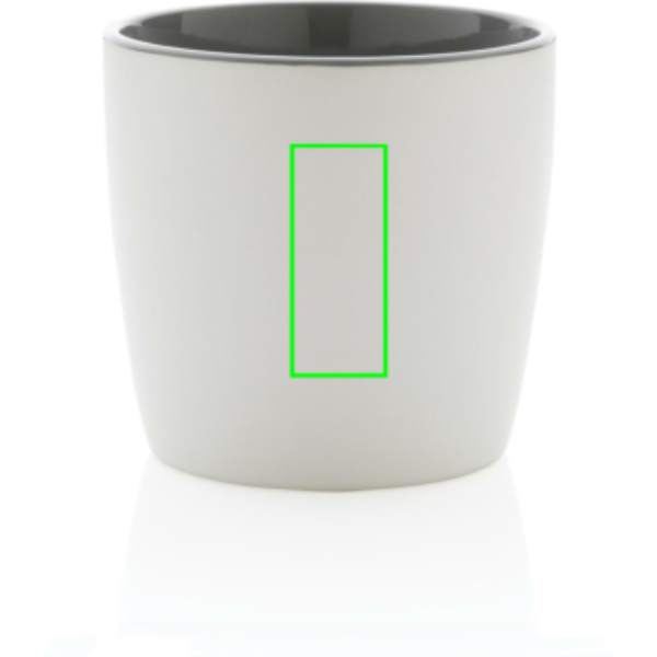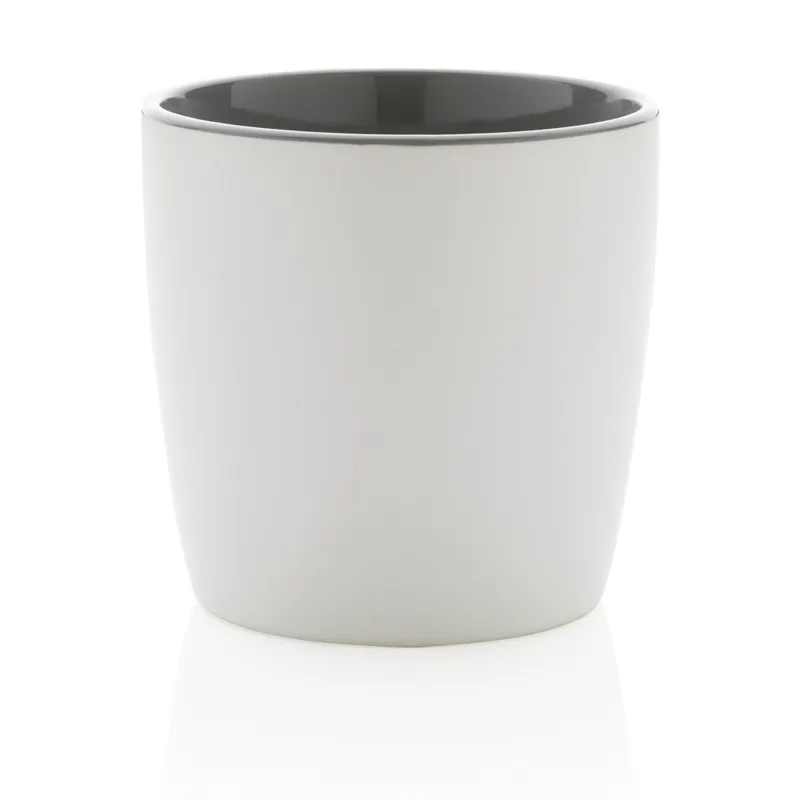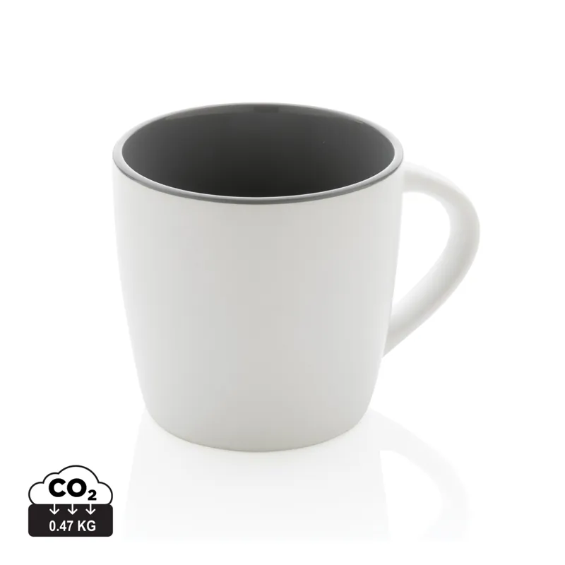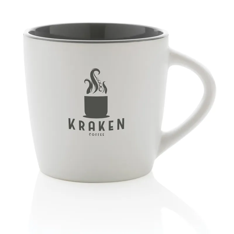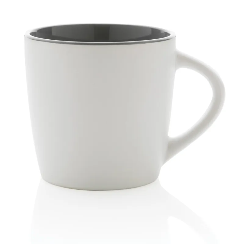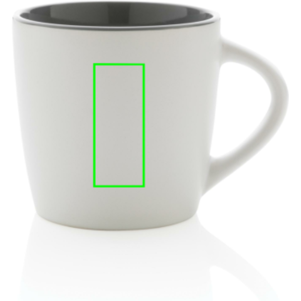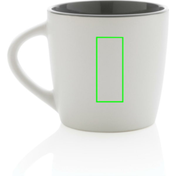 Kerámia bögre trendi dizájnnal, matt külső felülettel és belső színekkel díszítve. Mosogatógépben tisztítható, az EN12875-1 szabványnak megfelelően tesztelve (legalább 125 mosási ciklus minden dekorációs módszerhez). Kraft ajándékdobozban. Űrtartalma: 300 ml.