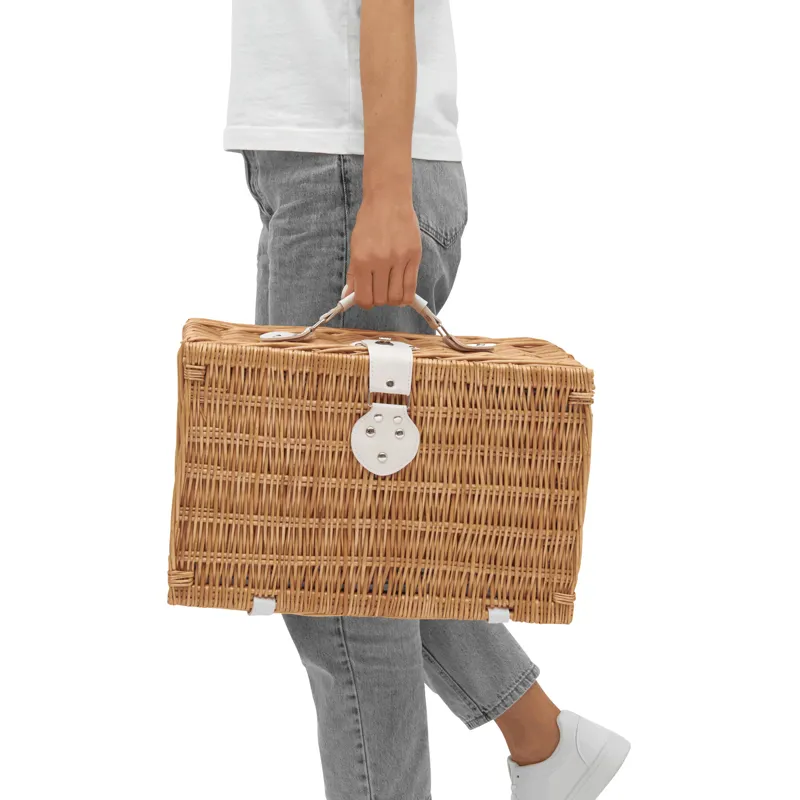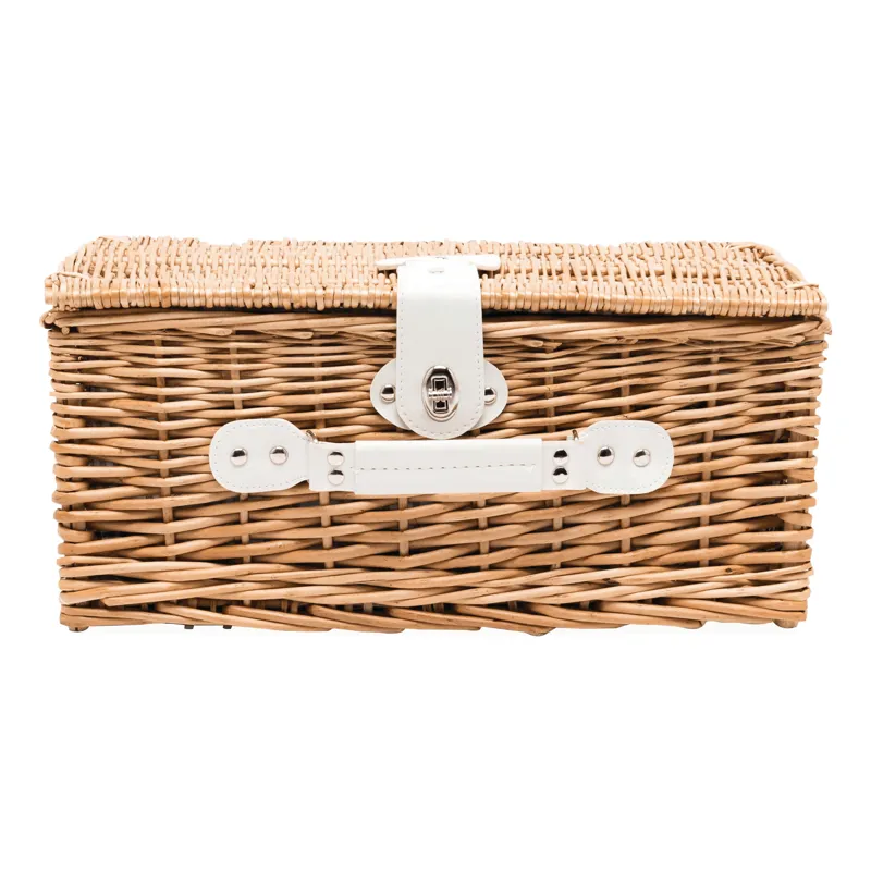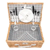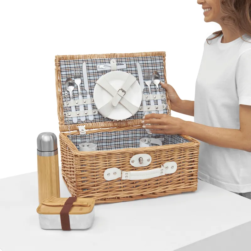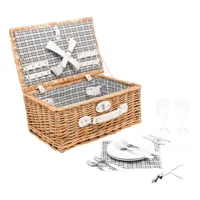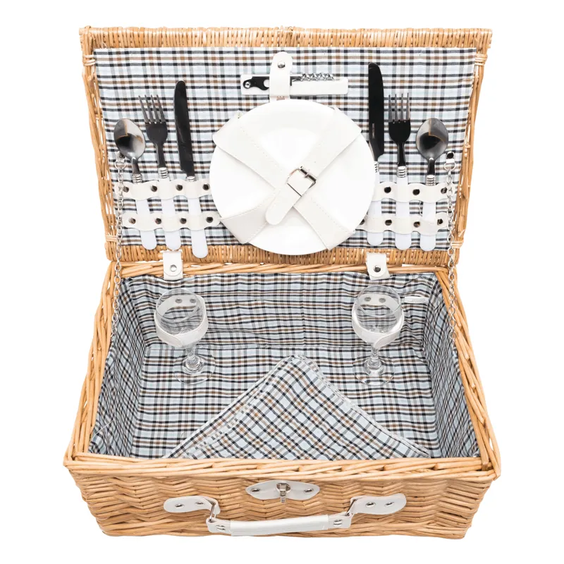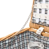 KINGS PARK fonott piknik kosár 2 fő részére: rozsdamentes acél evőeszköz műanyag nyéllel, kerámia tányérokkal, borospoharakkal, szalvétákkal és pincér késsel, fonott füllel és eltekerős zárral