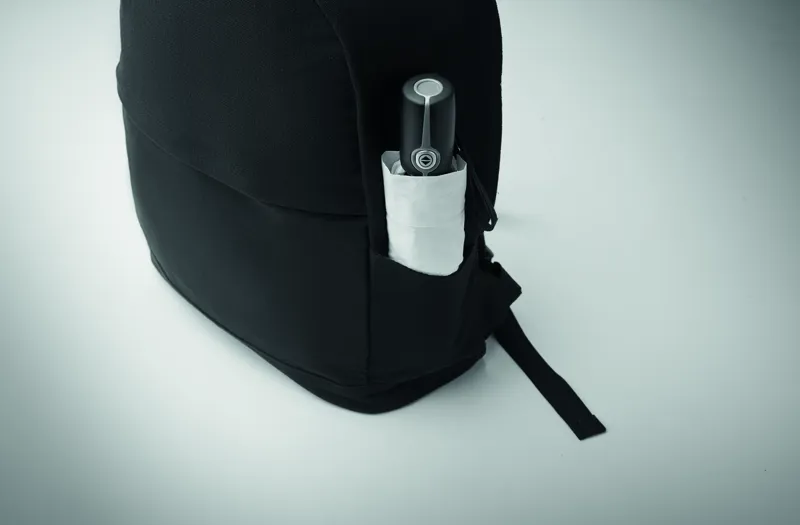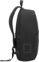 15 colos laptop hátizsák 70% fogyasztás előtti újrahasznosított pamutból és 30% újrahasznosított poliészterből. Elöl cipzáras zsebbel. Puha párnázott hát és vállpántok. Hátoldalán gurulós bőröndre illeszkedő pánttal.