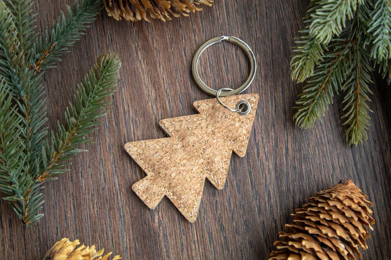 Karácsonyfa alakú természetes parafa és műbőr kulcstartó fém karikával.