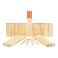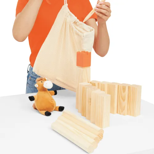 KUBB viking dobójáték fából, tartalma: 1 király, 4 sarokoszlop, 10 fahasáb, 6 dobóbot, pamuttáskával. Szabadtéri ügyességi játék 2-12 játékos részére