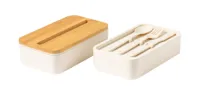 PP műanyag uzsonnás doboz evőeszköz készlettel (villa, kanál és kés), bambusz fedéllel, mobiltelefon tartó funkcióval és rugalmas pánttal. 2 darab 700 ml kapacitású rekesszel ellátva.