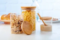 Boroszilikát üveg fűszertartó bambusz fedéllel és kanállal. 300 ml. Ideális cukor, fűszerek vagy diófélék tárolására.
