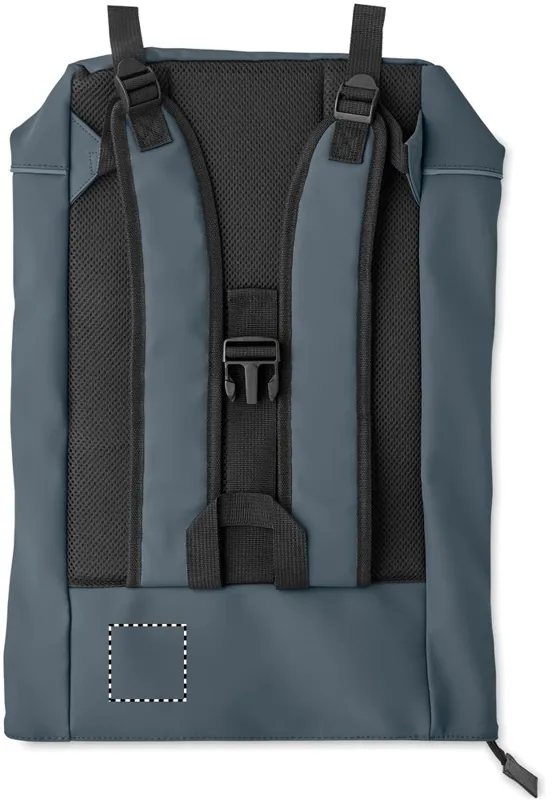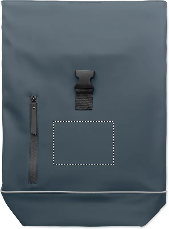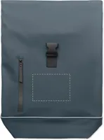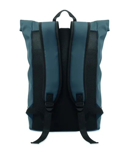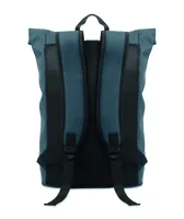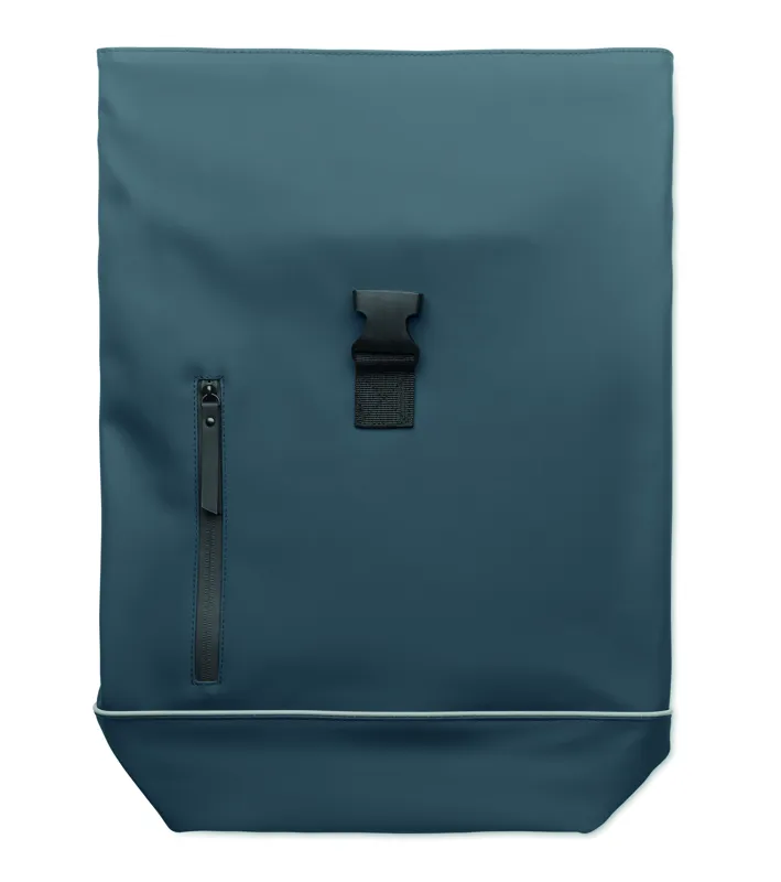15 colos, rolltop csavart záródású laptop hátizsák puha PU anyagból, párnázott hátoldallal és megerősített, fényvisszaverő csíkkal ellátott aljjal. Vízálló cipzáras elülső zseb. 210D RPET poliészter bélés.