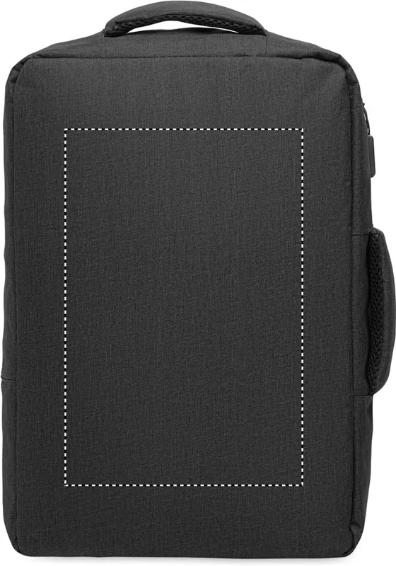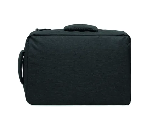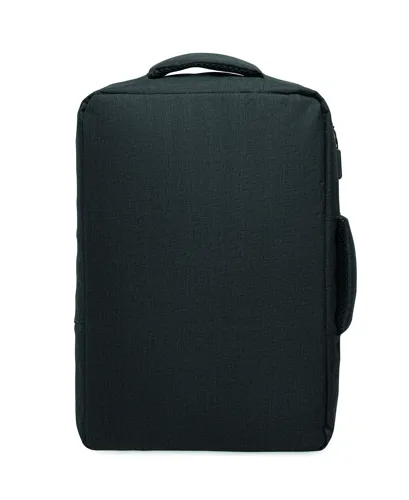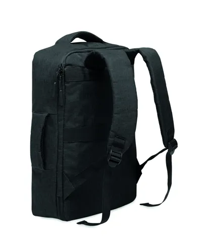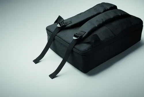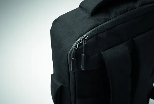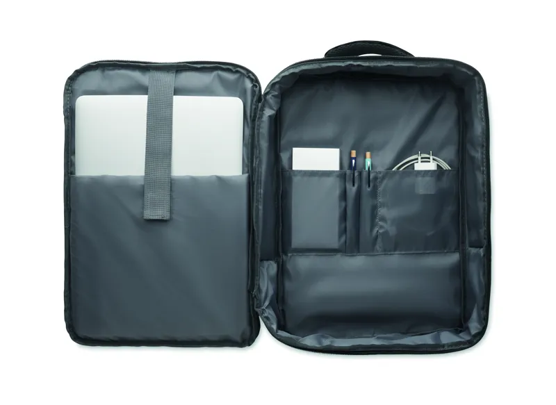 Vékony 15 colos laptop hátizsák 300D RPET-ből, 210D RPET béléssel. Laptop rekesszel, 2 belső nyitott zsebbel, 2 belső tolltartó zsebbel és 2 párnázott hordozófüllel. Puha párnázott hátoldal és vállpántok. Hátoldalán gurulós bőröndre illeszkedő pánttal.