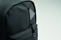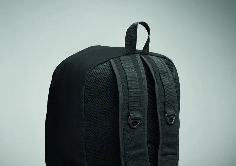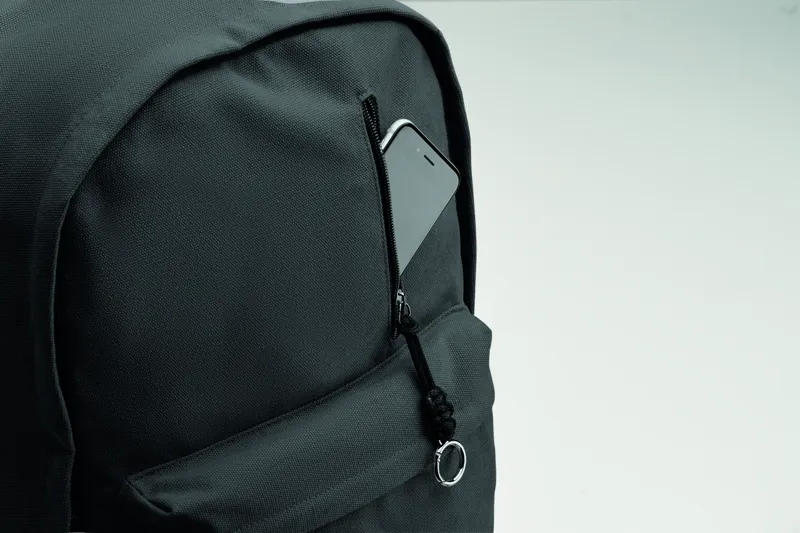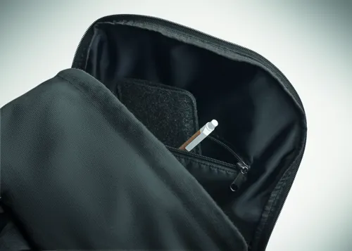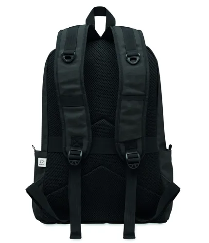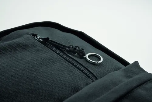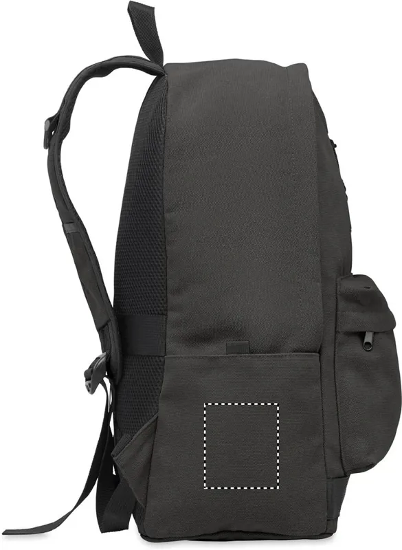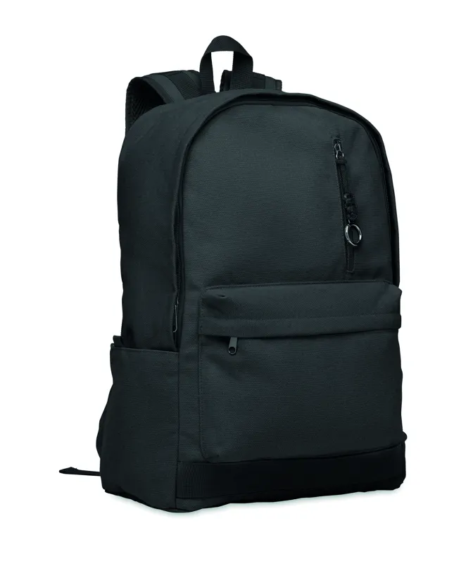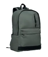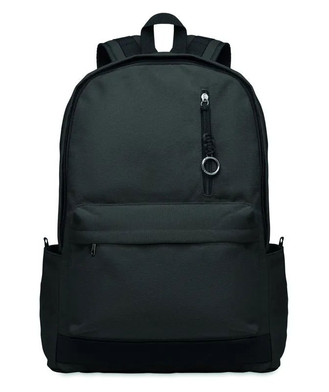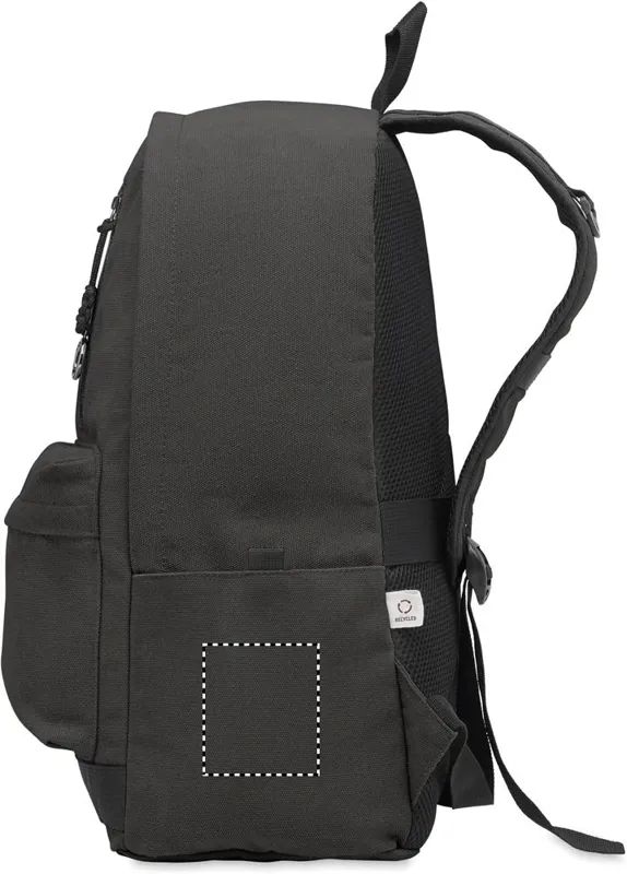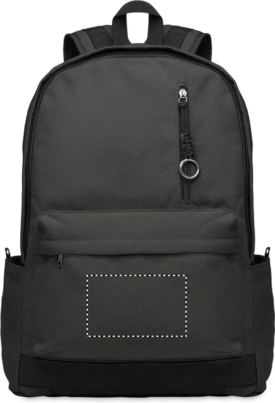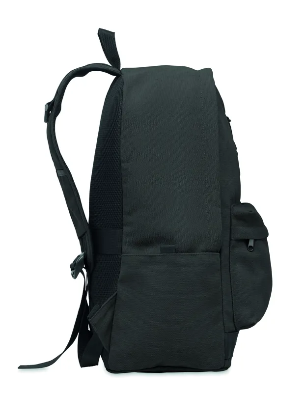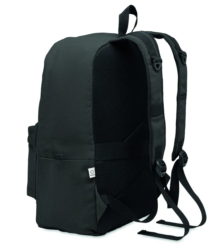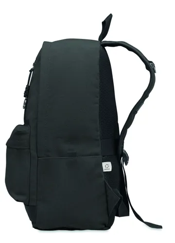 15 colos laptop hátizsák fogyasztás előtti újrahasznosított pamutból. Nagy elülső cipzáras rész belső laptop rekesszel. Kis cipzáras elülső zseb. Két oldalsó nyitott zseb. Párnázott hát, alj és vállpántok. 450 g/m².