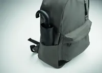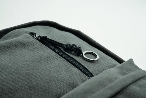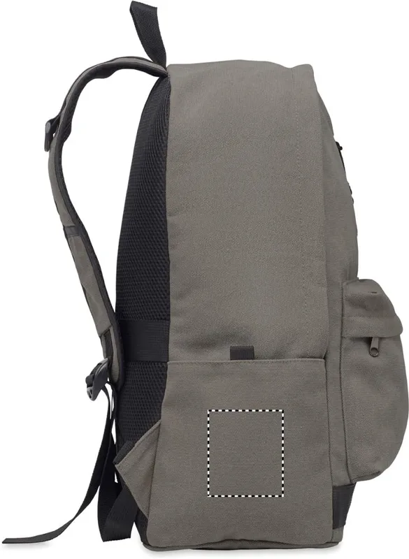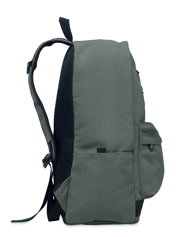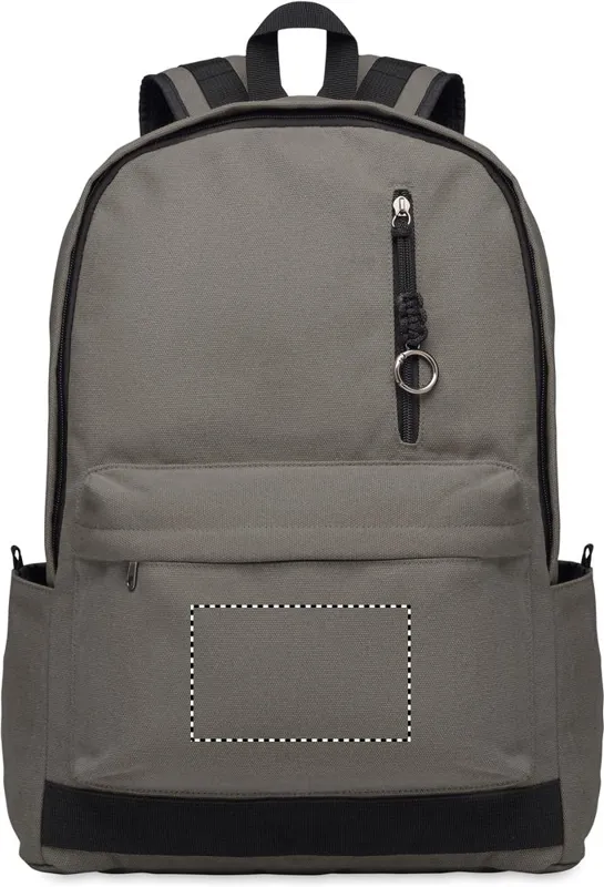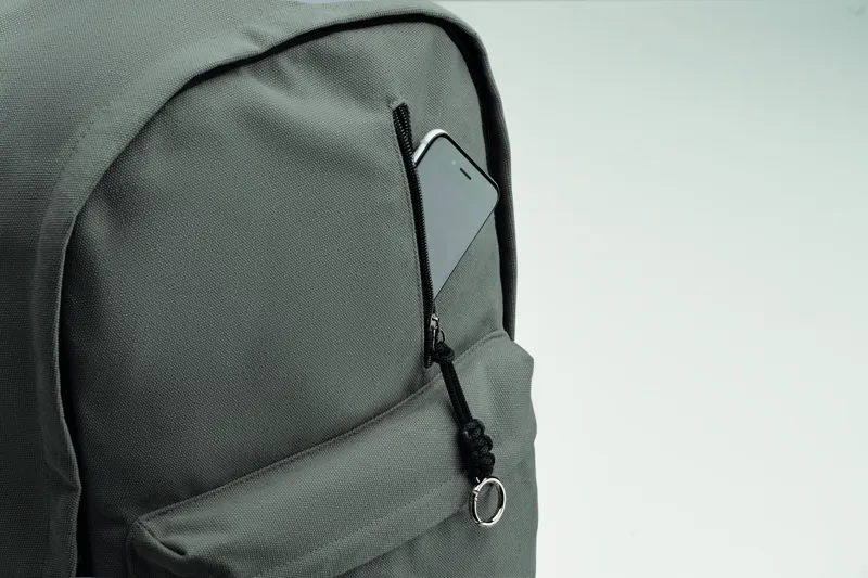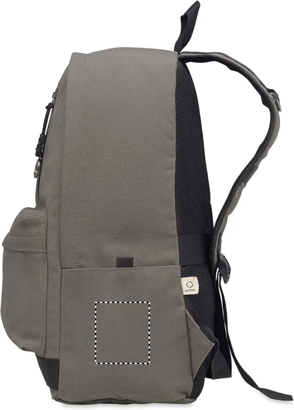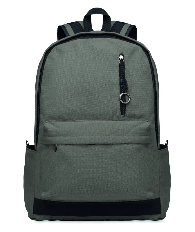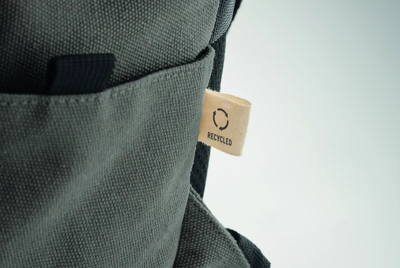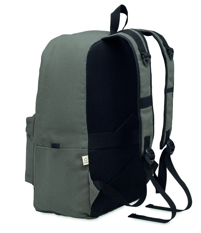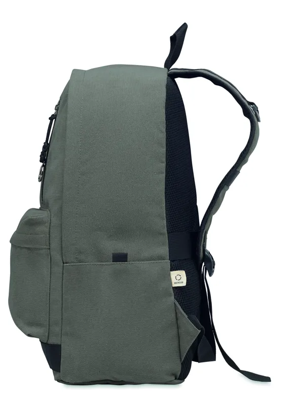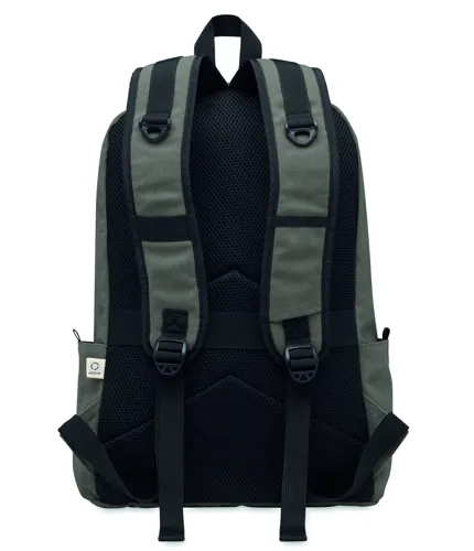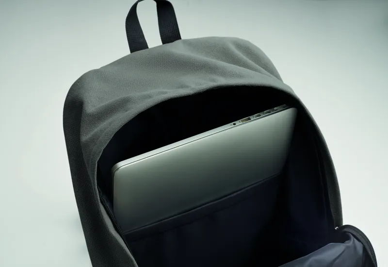 15 colos laptop hátizsák fogyasztás előtti újrahasznosított pamutból. Nagy elülső cipzáras rész belső laptop rekesszel. Kis cipzáras elülső zseb. Két oldalsó nyitott zseb. Párnázott hát, alj és vállpántok. 450 g/m².