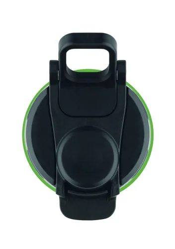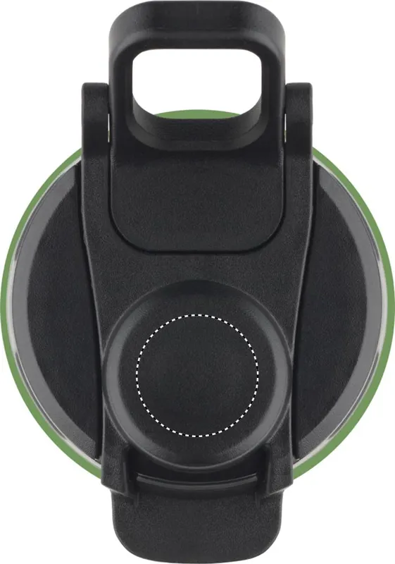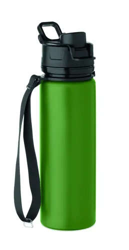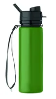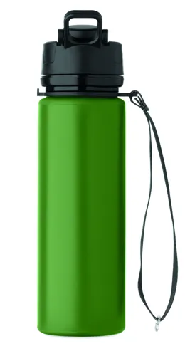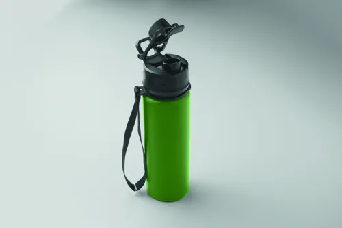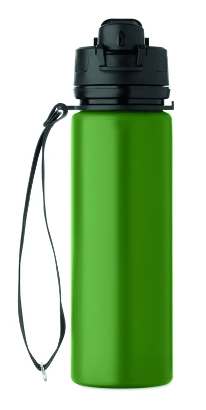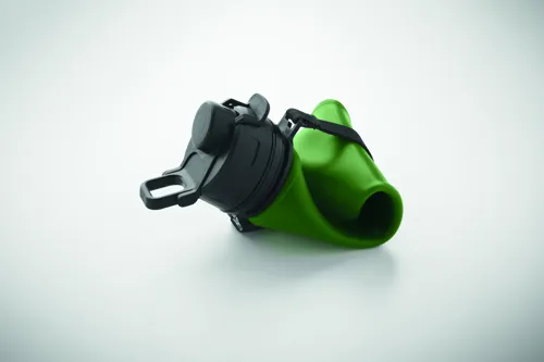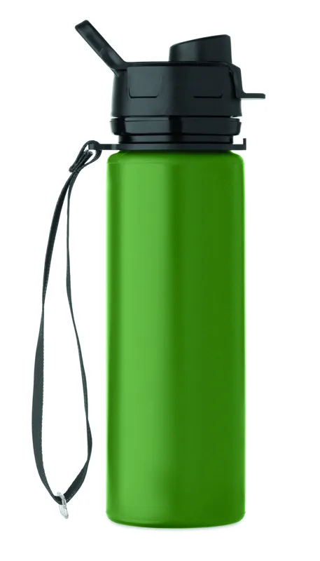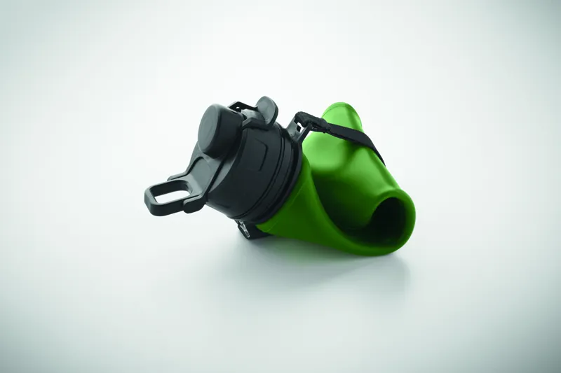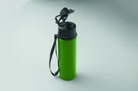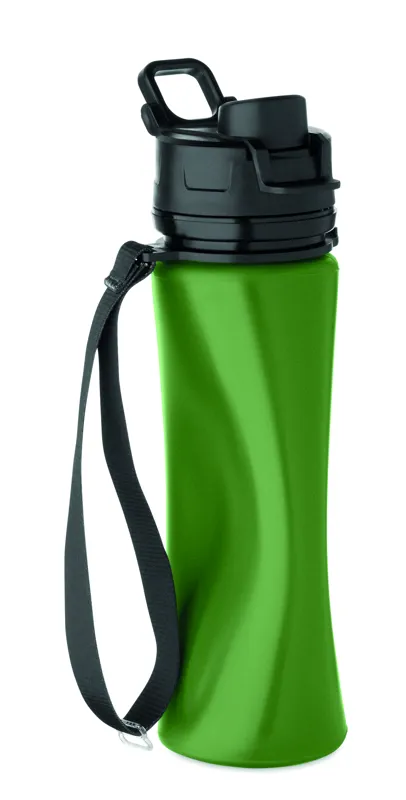 Összecsukható szilikon sportpalack PP fedéllel, fogantyúval, poliészter pánttal és átlátszó csattal az összecsukott állapotban történő rögzítéshez. Szivárgásmentes. Űrtartalom: 500 ml.