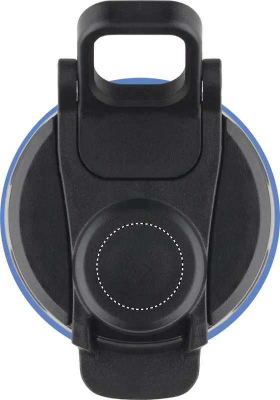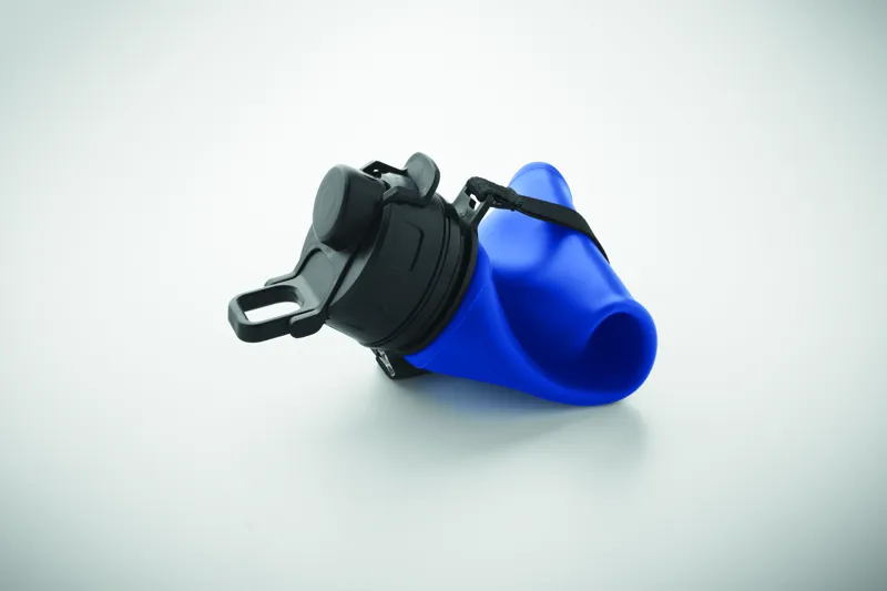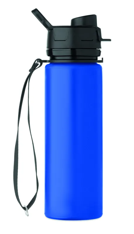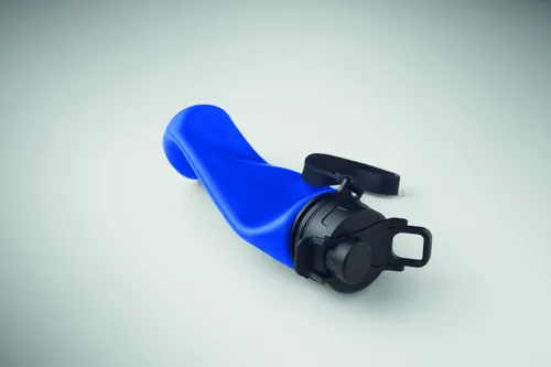 Összecsukható szilikon sportpalack PP fedéllel, fogantyúval, poliészter pánttal és átlátszó csattal az összecsukott állapotban történő rögzítéshez. Szivárgásmentes. Űrtartalom: 500 ml.
