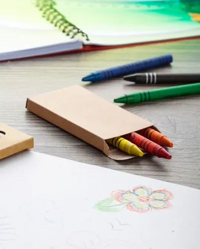 6 db-os fekete papírral bevont színes zsírkrétakészlet, barna, ablakos papírdobozban.