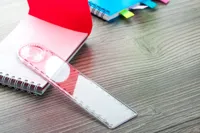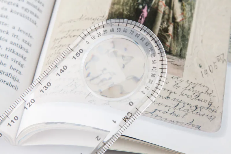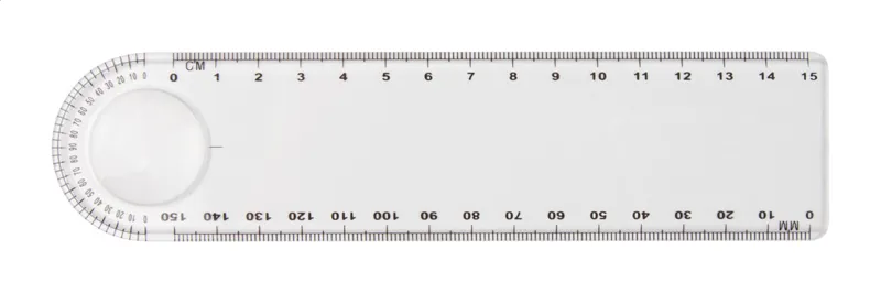 15 cm-es műanyag vonalzó nagyítóval és fokmérővel (cm és mm skálával).