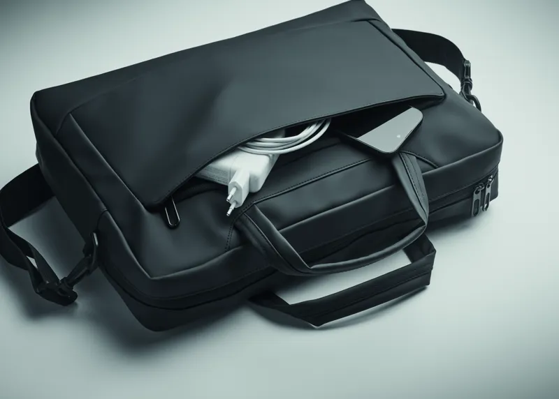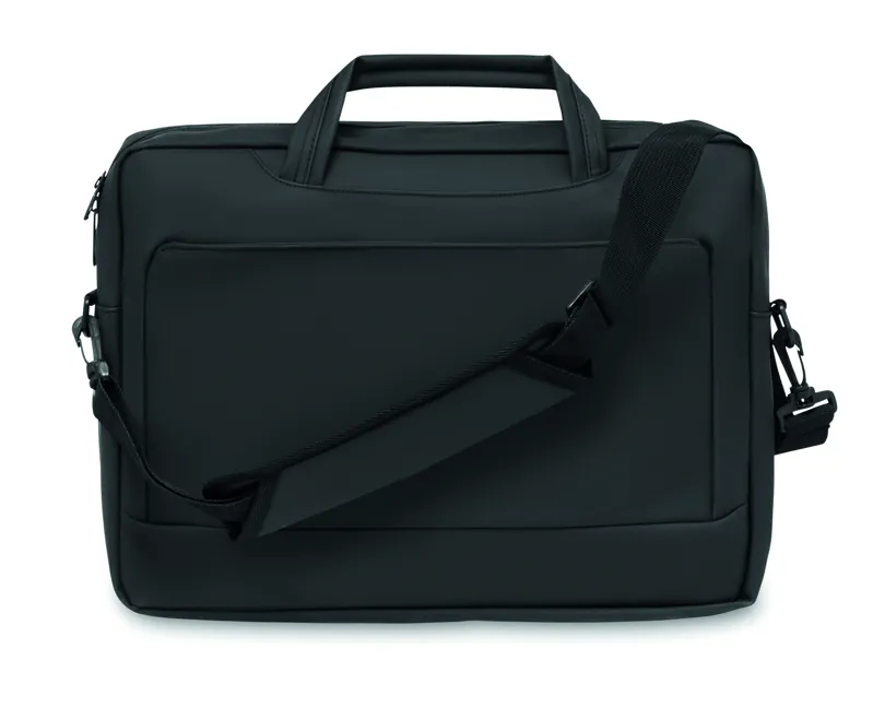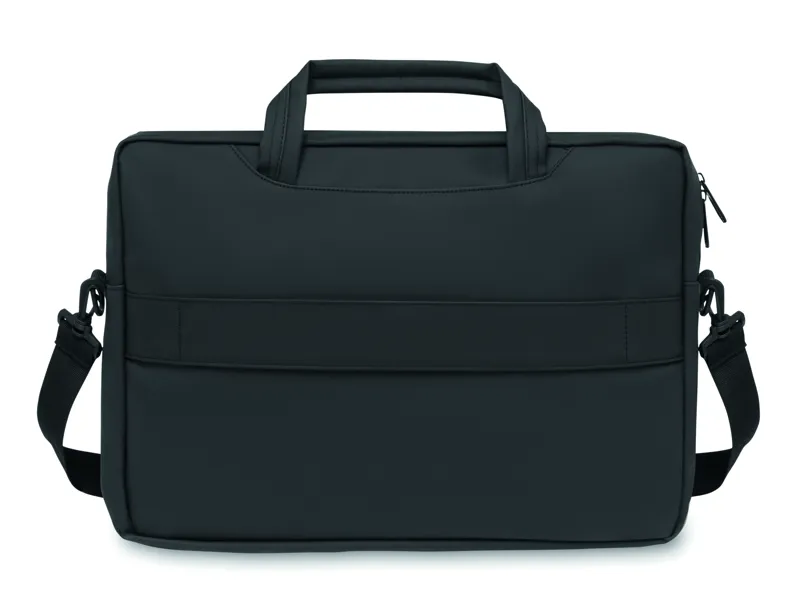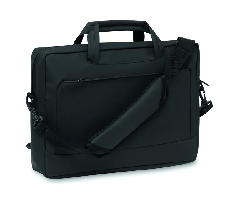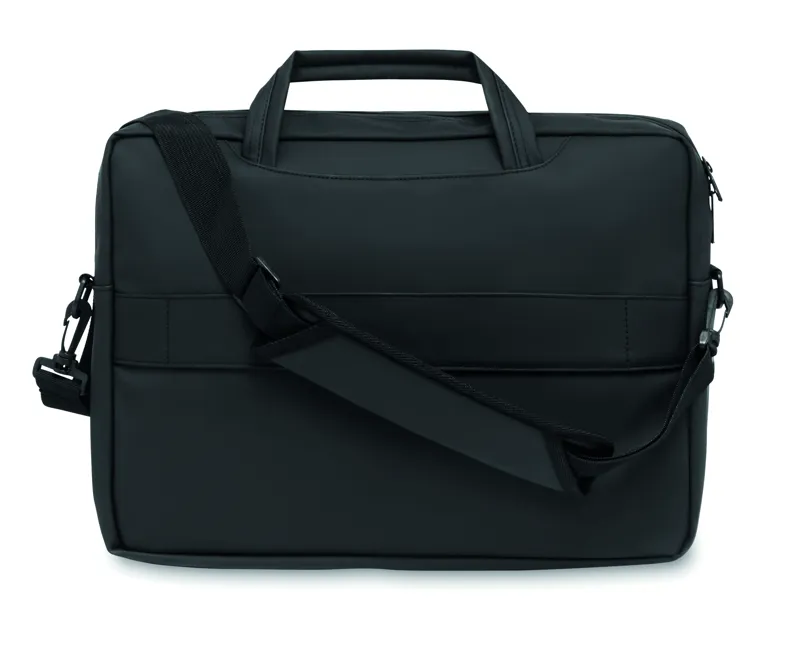 15 colos laptoptáska puha PU-ből. Párnázott laptop rekesz és cipzáras elülső zseb több rekesszel. 210D RPET poliészter bélés. Párnázott, levehető és állítható vállpánt. Hátoldalán gurulós bőröndre illeszkedő pánttal.