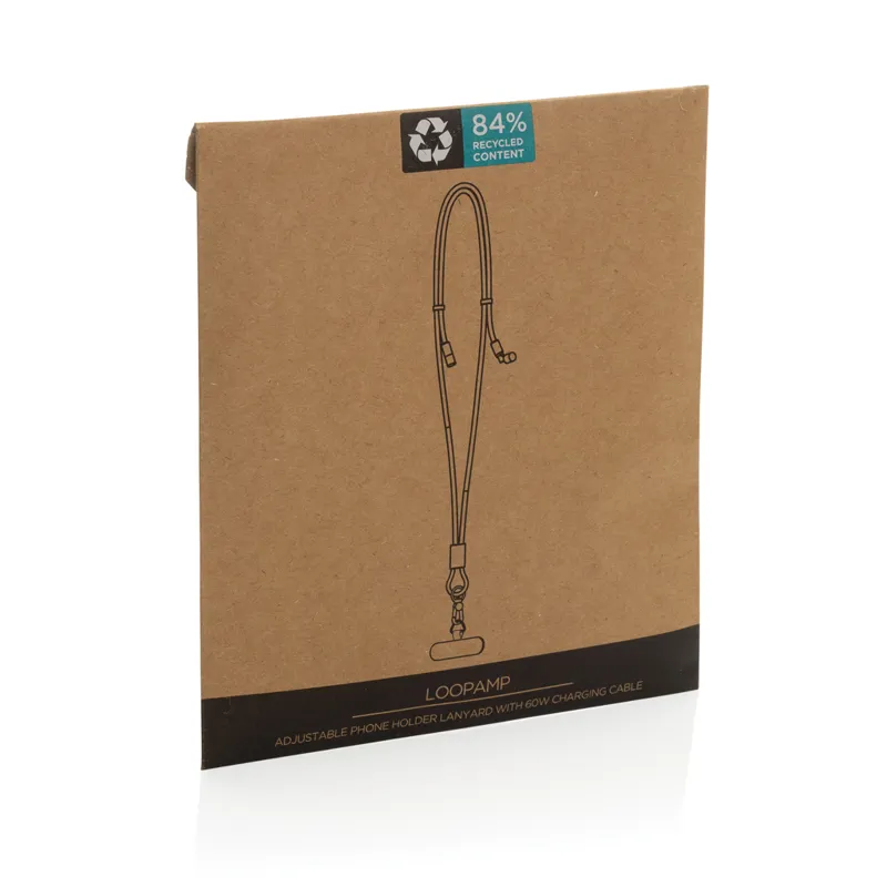 Bemutatjuk a LoopAmp-ot – RCS-tanúsított, újrahasznosított RPET-ből készült 160 cm telefontartó zsinórt. Az RCS (Recycled Claim Standard) igazolja a termék újrahasznosított tartalmát a teljes ellátási láncon keresztül. Újrahasznosított anyagtartalom: 84% a teljes tömeg alapján. Aluminium, réz, ón ötvözet. Prémium minőségű nyakpántként lett kialakítva, erős szalaggal, precízen megmunkált csatlakozógyűrűvel és kampóval, amely megakadályozza a készülék leejtését. Karcsú kialakítása modern megjelenést kölcsönöz, miközben szabadon hagyja a kezed és tehermentesíti a zsebeket – ideális utazáshoz, sporthoz vagy szabadtéri programokhoz. A LoopAmp emellett akár 60 W gyorstöltésre képes USB-C kábelként is működik. Megbízható, nagy hatékonyságú töltést biztosít telefonhoz, tablethez vagy laptophoz, megerősített csatlakozóival és tartós anyagaival. Adatátvitelt is támogat. PVC-mentes, FSC-minősítésű csomagolásban.