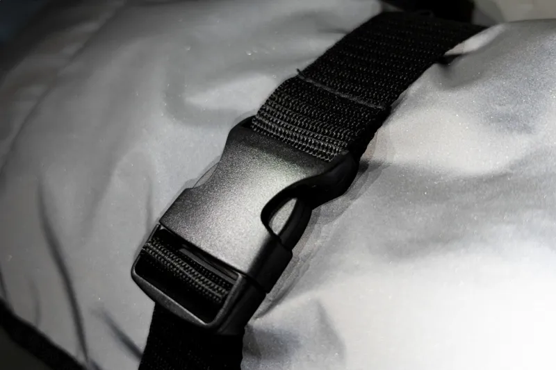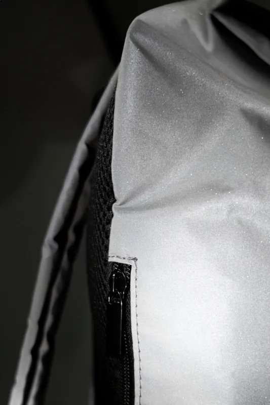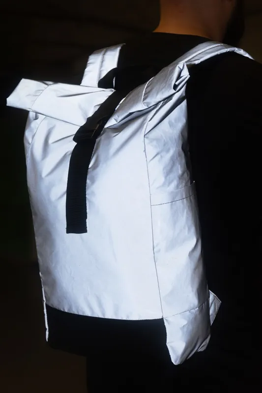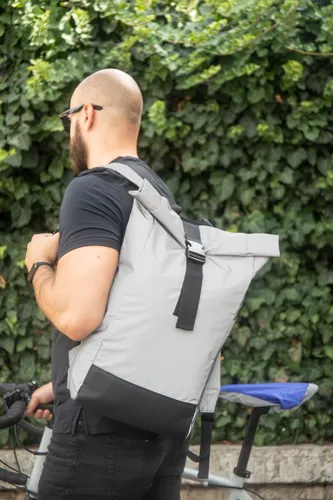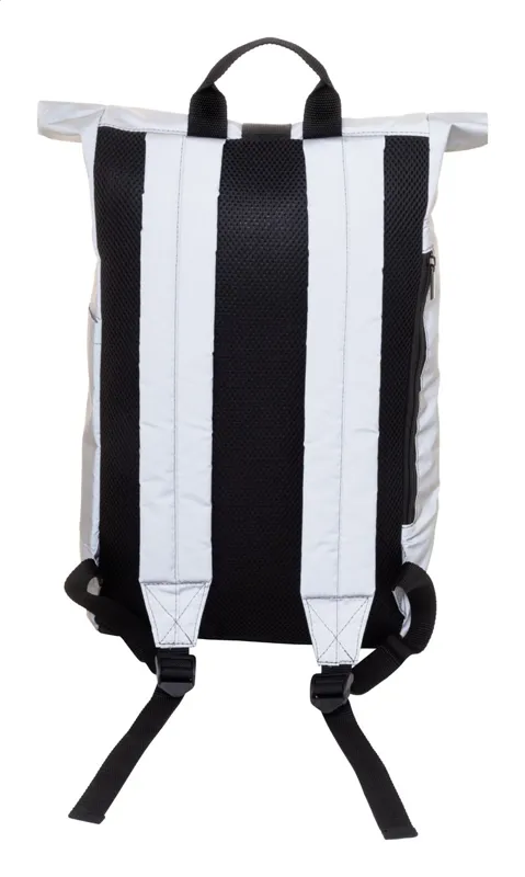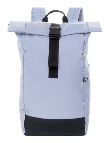 Fényvisszaverő rolltop hátizsák RPET poliészter anyagból, csattal zárható fő rekesszel, rejtett cipzáras zsebbel, párnázott laptop rekesszel (15"), oldalzsebekkel, párnázott hát- és vállpántokkal. Megkülönböztető RPET címkével. A termék kizárólag promóciós célra alkalmas, nem minősül egyéni védőfelszerelésnek.