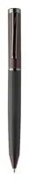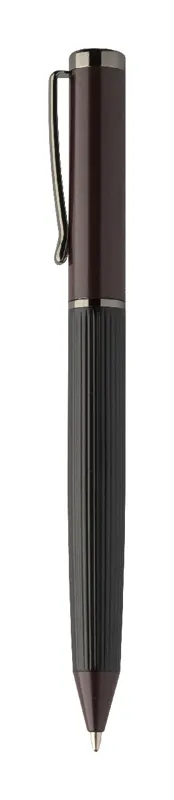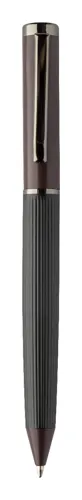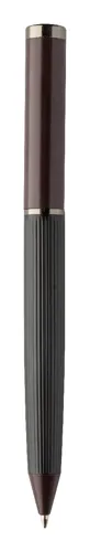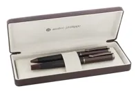 Elegáns, fém golyóstoll és rollertoll szett csíkos testtel, színes díszítőelemekkel és fényes fegyverfém részletekkel. Színben hozzáillő ajándékdobozban, kék tollbetéttel. André Philippe márkatermék.