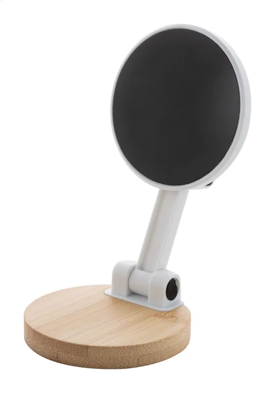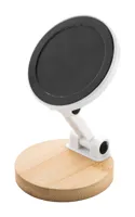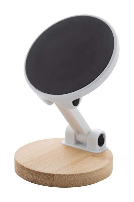 Mágneses asztali mobiltelefon tartó bambuszból és újrahasznosított ABS műanyagból. Öntapadós fémgyűrűvel, amellyel bármilyen eszközön használhatja a mágneses funkciót. Kompatibilis az iPhone® 12 vagy újabb készülékekkel.