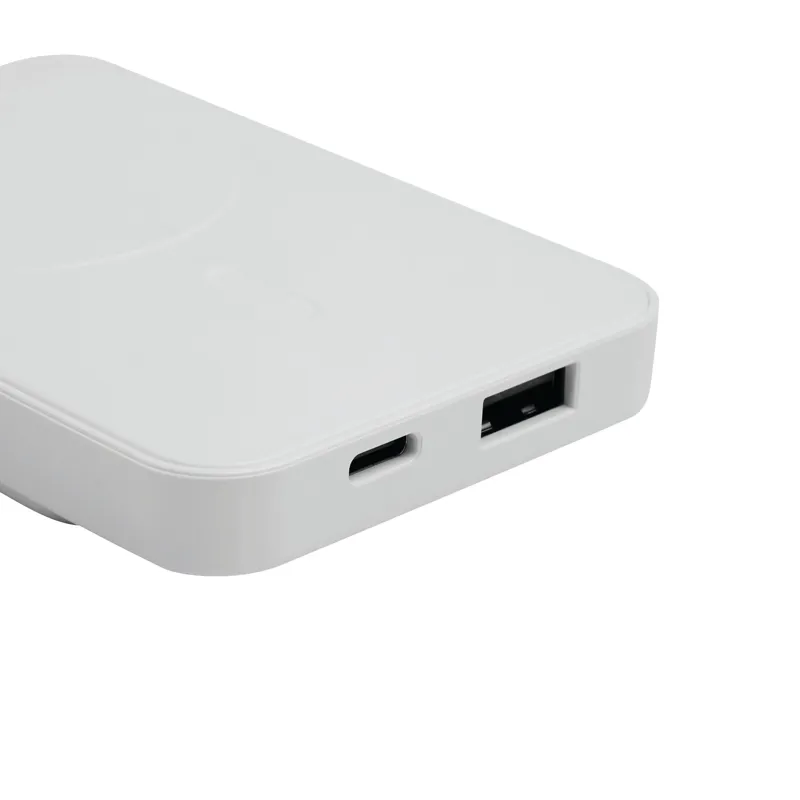 MAGNET powerbank: alkalmas okostelefonokhoz és USB-eszközökhöz, az eszköz vezeték nélküli töltése az érintkezőfelületre helyezve (az eszköznek kompatibilisnek kell lennie az induktív töltéssel), mágneses erő tartja a készüléket a powerbankon (a készüléktől függően), USB-kábel USB Type-C csatlakozóval (hossz: kb. 30 cm), töltöttségi szint jelzővel százalékban, be/ki kapcsolóval, nagy teljesítményű akkumulátorral, kapacitás: 5.000 mAh, 1 USB Type-C és 1 USB Type A csatlakozóval, bemeneti teljesítmény: 5V/2A, kimeneti teljesítmény: 5V/2A