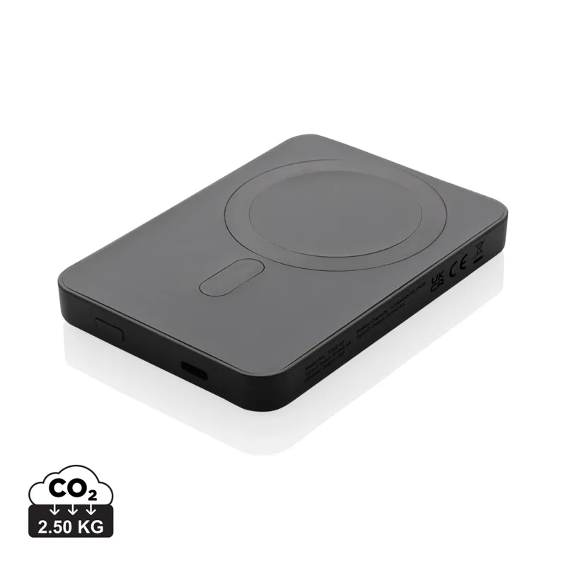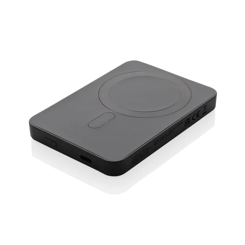 5000 mAh, zsebméretű powerbank 5W-os mágneses, vezeték nélküli töltővel, melynek háza RCS újrahasznosított ABS műanyagból készült. Az RCS-tanúsítvány biztosítja az újrahasznosított anyagok ellátási láncát. Teljes újrahasznosított anyagtartalom: 20% a termék összsúlya alapján. A powerbank hosszú élettartamú, A-fokozatú, 5000 mAh-s lítium-polimer akkumulátort tartalmaz. A teljesítményjelzők jelzik a fennmaradó energiaszintet. ; C típusú bemenet 5 V/2,4 A; C típusú kimenet: 5 V/2 A. 4 A A termék és tartozékai PVC-mentesek. RCS újrahasznosított TPE töltőkábellel. FSC® mix csomagolásban.