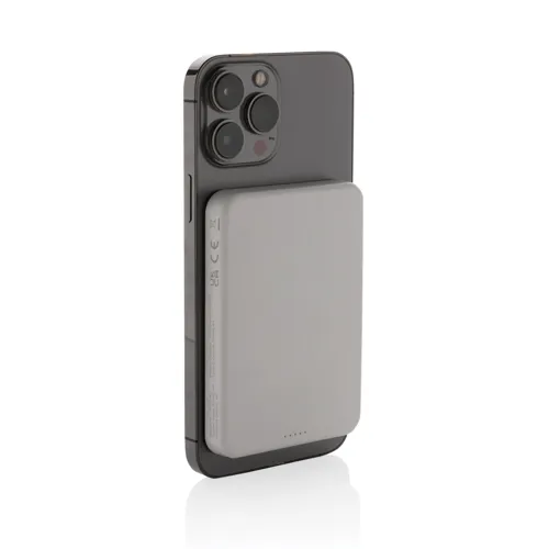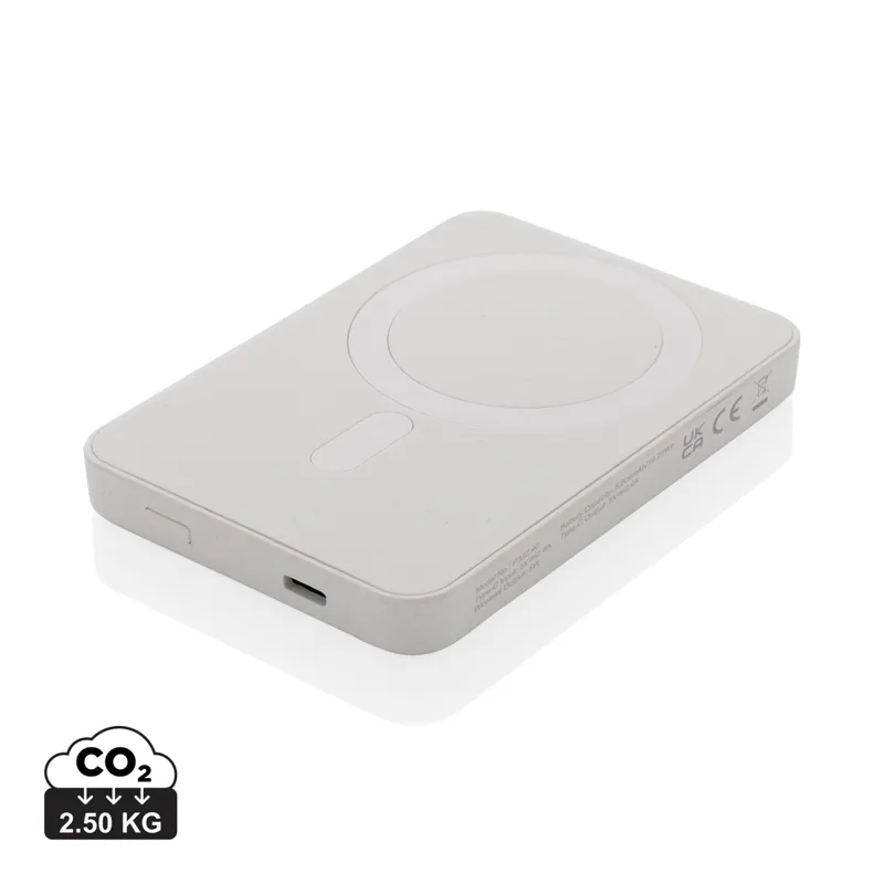 5000 mAh, zsebméretű powerbank 5W-os mágneses, vezeték nélküli töltővel, melynek háza RCS újrahasznosított ABS műanyagból készült. Az RCS-tanúsítvány biztosítja az újrahasznosított anyagok ellátási láncát. Teljes újrahasznosított anyagtartalom: 20% a termék összsúlya alapján. A powerbank hosszú élettartamú, A-fokozatú, 5000 mAh-s lítium-polimer akkumulátort tartalmaz. A teljesítményjelzők jelzik a fennmaradó energiaszintet. ; C típusú bemenet 5 V/2,4 A; C típusú kimenet: 5 V/2 A. 4 A A termék és tartozékai PVC-mentesek. RCS újrahasznosított TPE töltőkábellel. FSC® mix csomagolásban.