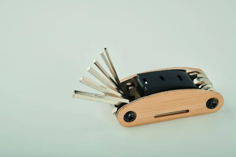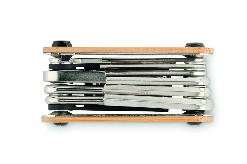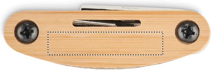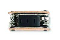 Rozsdamentes acélból készült multifunkciós zsebszerszám bambusz burkolattal. 11 funkció. Tartalmaz: imbuszkulcsot, laposkulcsot , hosszabbítót, csillagcsavarhúzót és dugókulcsot.
