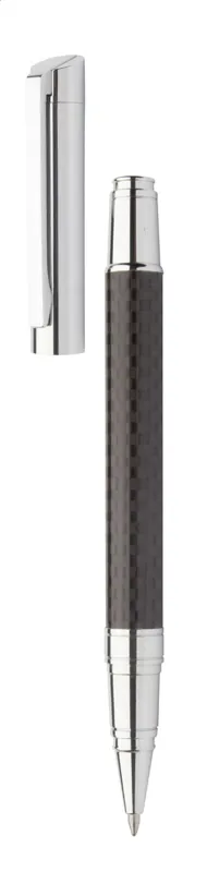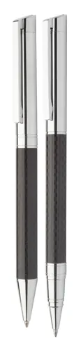 Elegáns, fém golyóstoll és rollertoll szett szénmintás testtel és fényes króm részletekkel. Fekete díszdobozban, kék tollbetéttel szállítjuk. André Philippe márkatermék.