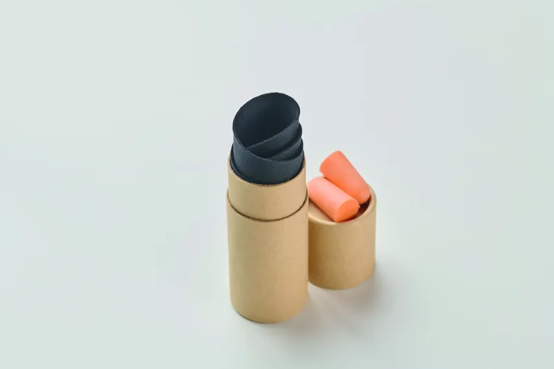 Rugalmas poliészter alvómaszkot és EVA füldugót tartalmazó utazószett. Hengeres papírdobozban.