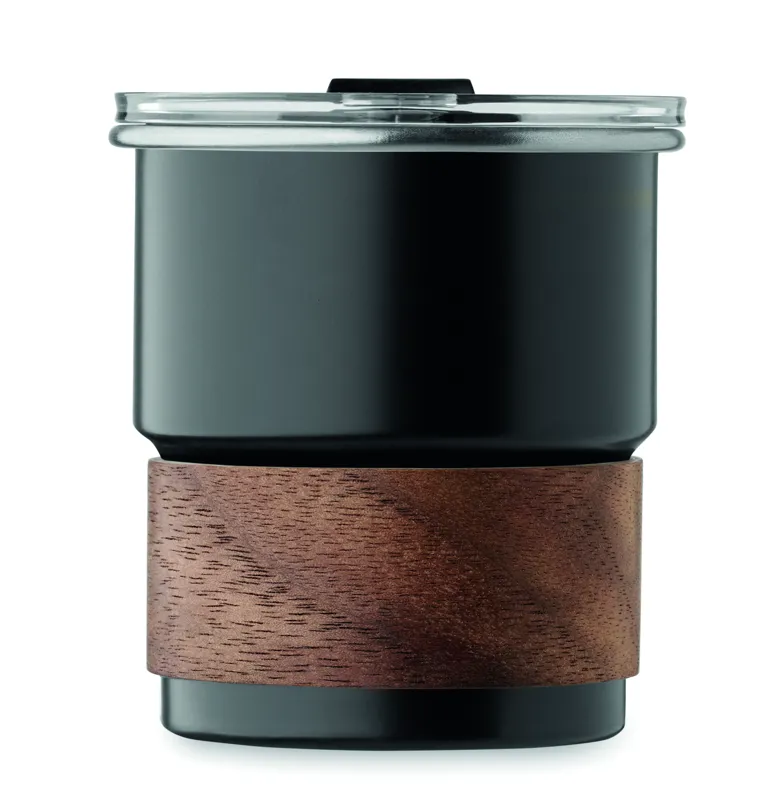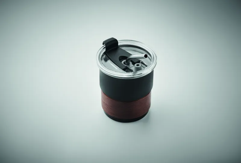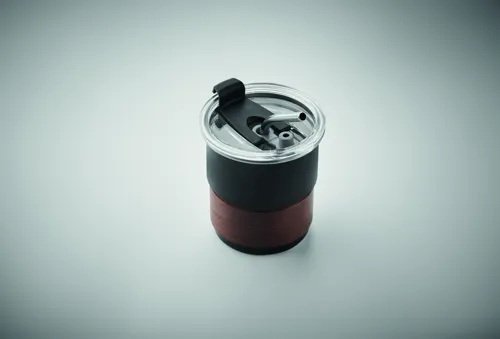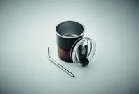 Szimplafalú pohár újrahasznosított rozsdamentes acélból (90% újrahasznosított rozsdamentes acél és 10% rozsdamentes acél), levehető akáciafa markolattal, rozsdamentes acél szívószállal. Szivárgásmentes fedél szívószállal és nyitható ivónyílással. Űrtartalom: 260 ml. Mivel ez egy szimplafalú bögre, hőátadás lehetséges.