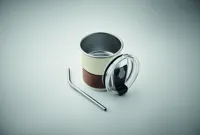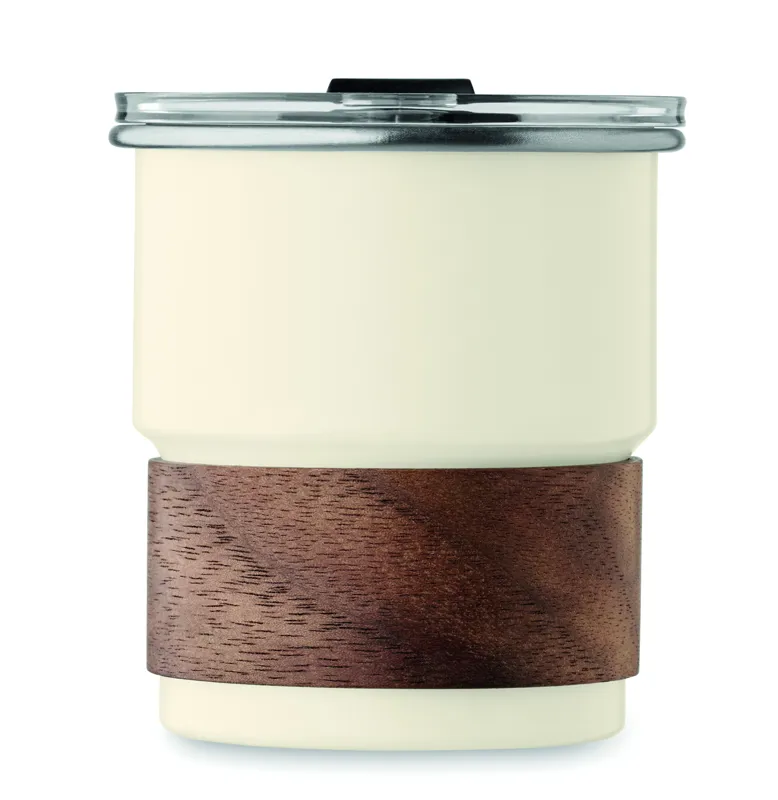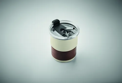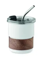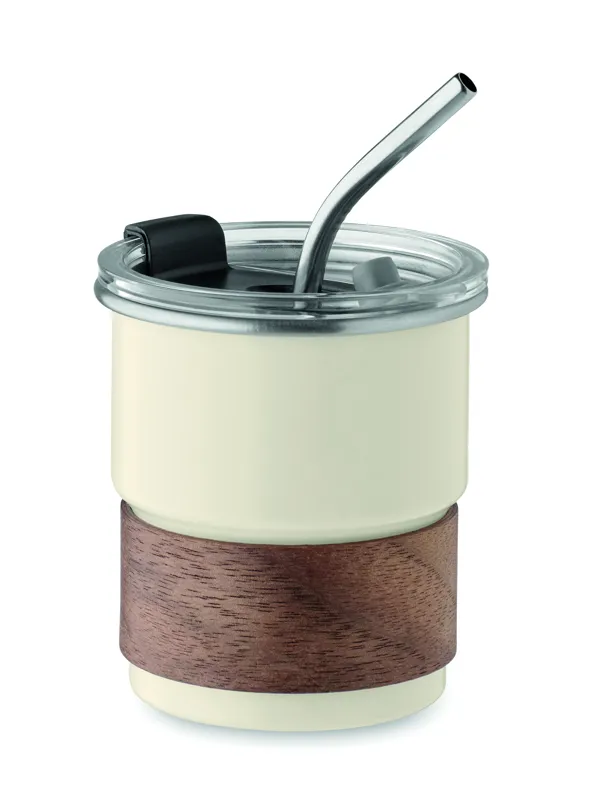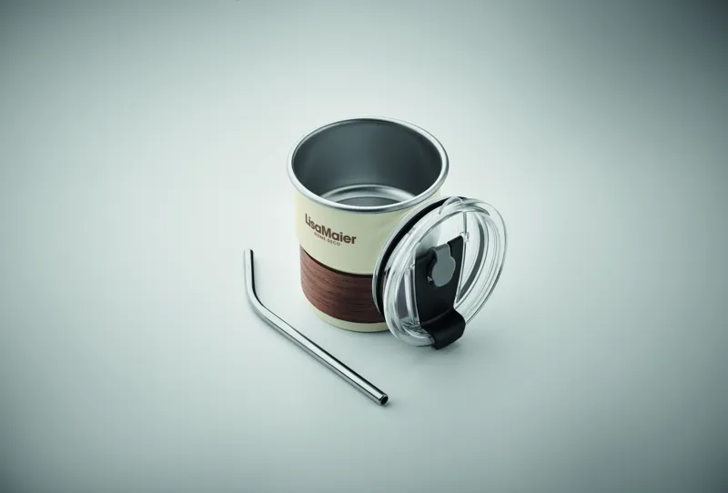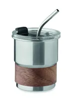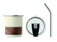 Szimplafalú pohár újrahasznosított rozsdamentes acélból (90% újrahasznosított rozsdamentes acél és 10% rozsdamentes acél), levehető akáciafa markolattal, rozsdamentes acél szívószállal. Szivárgásmentes fedél szívószállal és nyitható ivónyílással. Űrtartalom: 260 ml. Mivel ez egy szimplafalú bögre, hőátadás lehetséges.