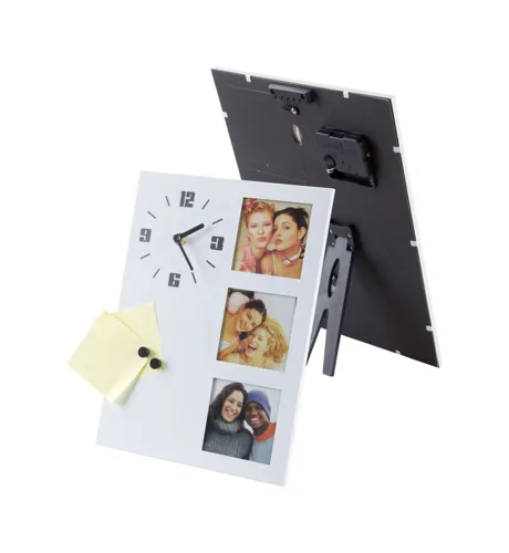 Asztali óra 3 fényképtartó rekesszel (75x75 mm) és mágnessel. 1 AA elemmel működik, elem nélkül szállítjuk.