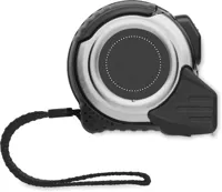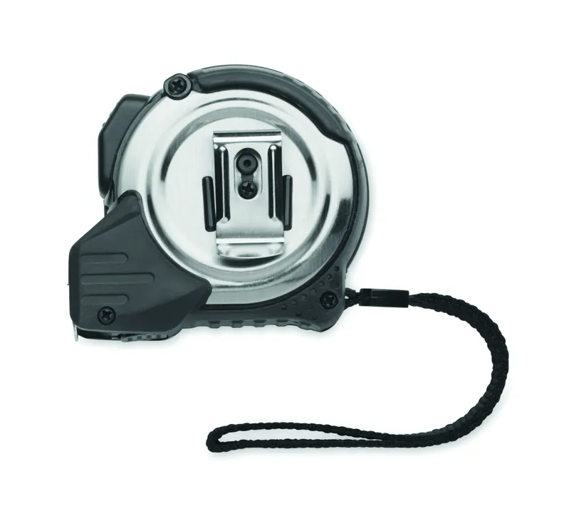 5 m-es mérőszalag ütésálló gumiborítással és a szalag visszaugrását meggátló automatikus zárral. Csuklópánttal, a hátoldalon ezüst színű fém csíptetővel.