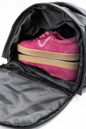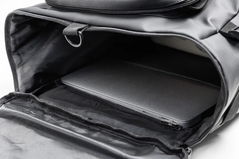 Vízálló RPET hátizsák cipzáras fő rekesszel, 2 cipzáras elülső zsebbel, oldalsó zsebekkel és cipőtartó rekesszel. Párnázott laptop rekesszel (15"), párnázott hátrésszel és vállpántokkal. Méretre állítható oldalsó pántokkal. PU bevonatú 600D RPET poliészter, megkülönböztető RPET címkével.