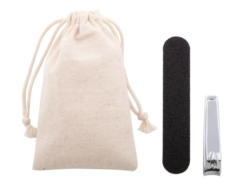 Manikűrkészlet összehúzható pamut tasakban. Egy körömcsipeszt és egy körömreszelőt tartalmaz.