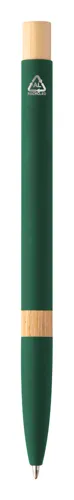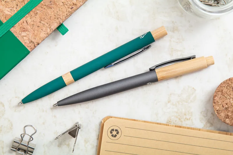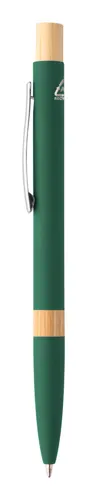 Újrahasznosított alumínium golyóstoll bambusz részekkel, gumírozott felülettel és króm klipsszel. Speciális bevonattal rendelkezik, amely különlegesen fényessé teszi a gravírozott emblémát. Kék tollbetéttel.