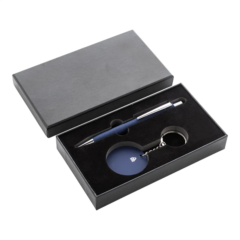 2 részes ajándékkészlet fekete papír díszdobozban. Tartalmazz egy újrahasznosított alumínium golyóstollat gumírozott bevonattal és kék tollbetéttel, valamint egy újrahasznosított rozsdamentes acél kulcstartót gumírozott felülettel. Mindkét elem speciális bevonattal rendelkezik a tükörgravírozáshoz.