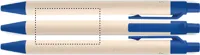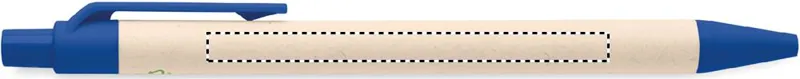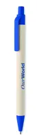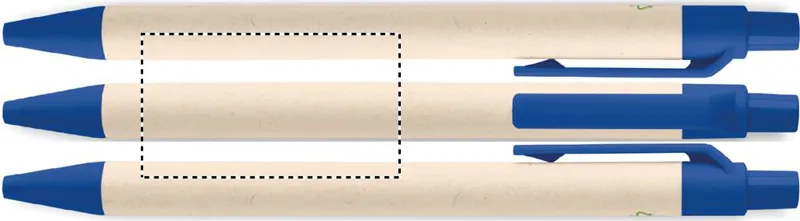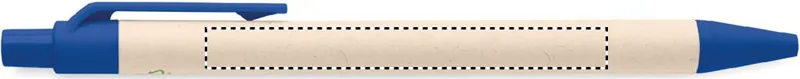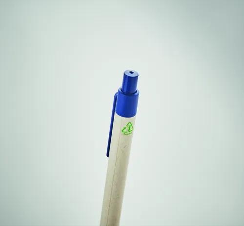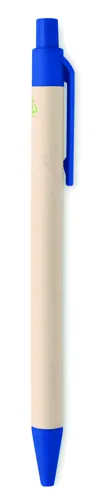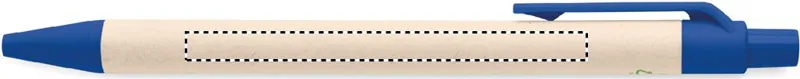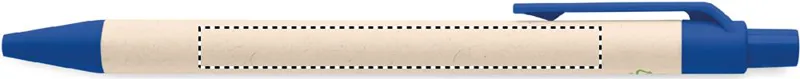 Nyomógombos golyóstoll újrahasznosított tejesdobozból készült tolltesttel (70 %-ban újrahasznosított tejesdoboz és 30 %-ban újrahasznosított papír) és PLA szerelvényekkel (100%-ban biológiailag lebomló kukoricából). Kéken író betéttel.
